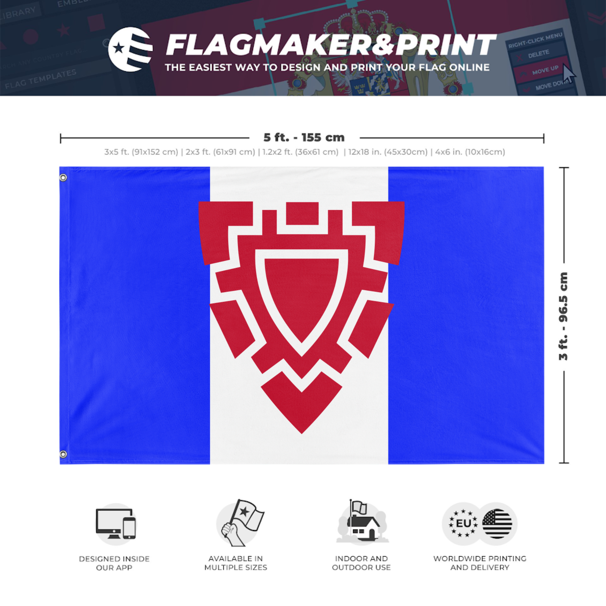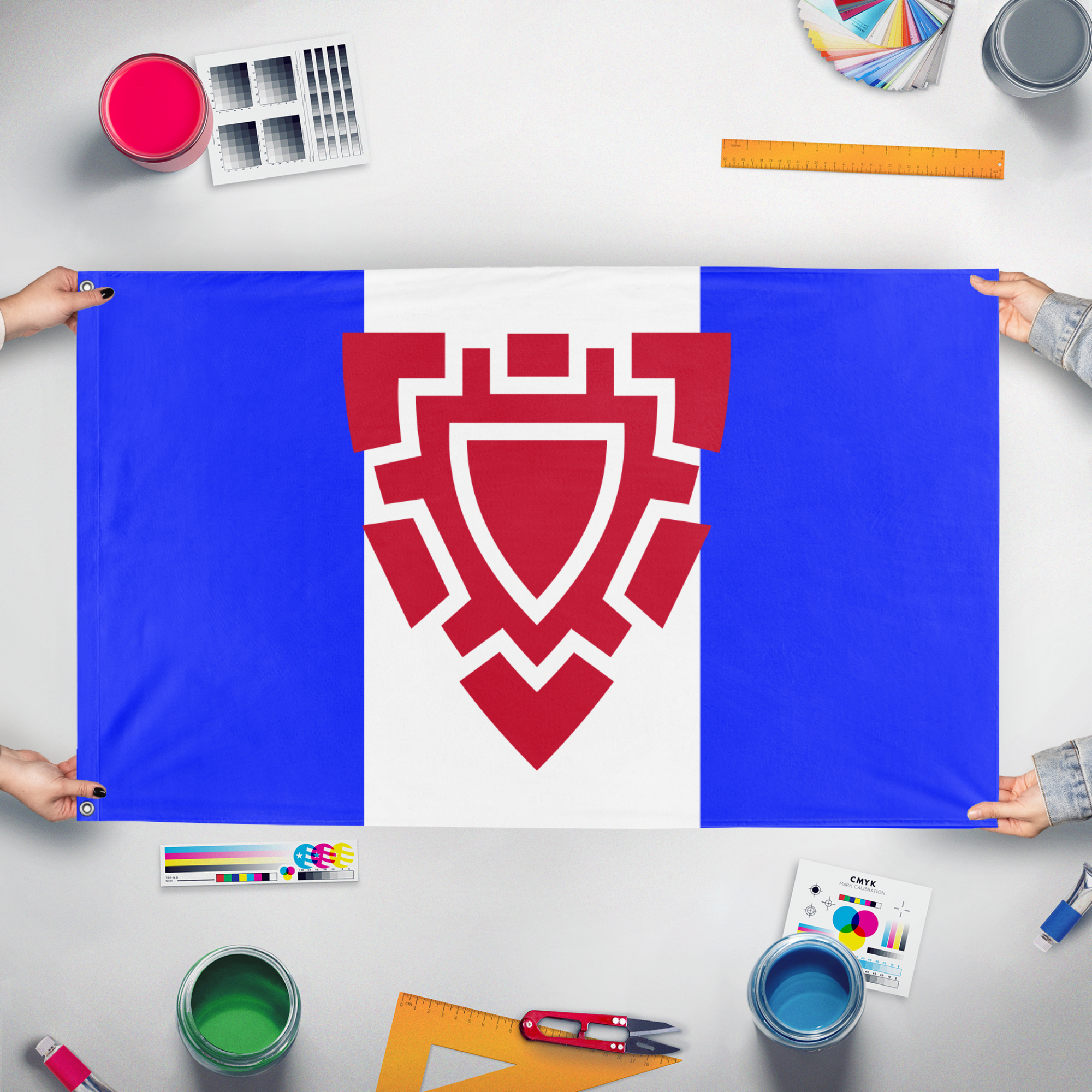 Our integrated flag maker app allows anyone to design and print their own flag. After finishing your design, you can print your flag in three easy steps.