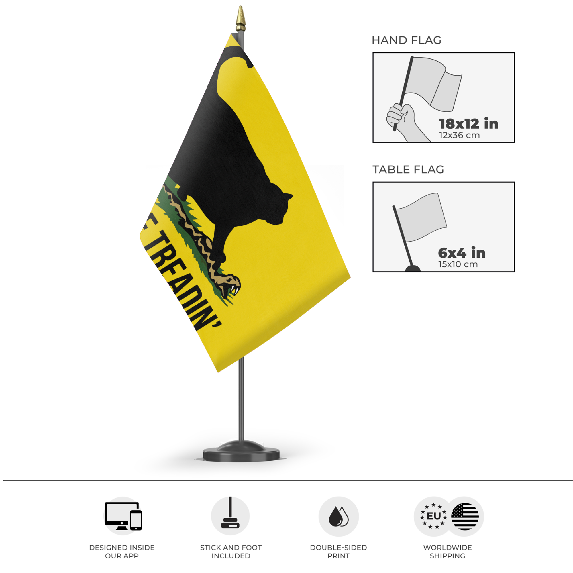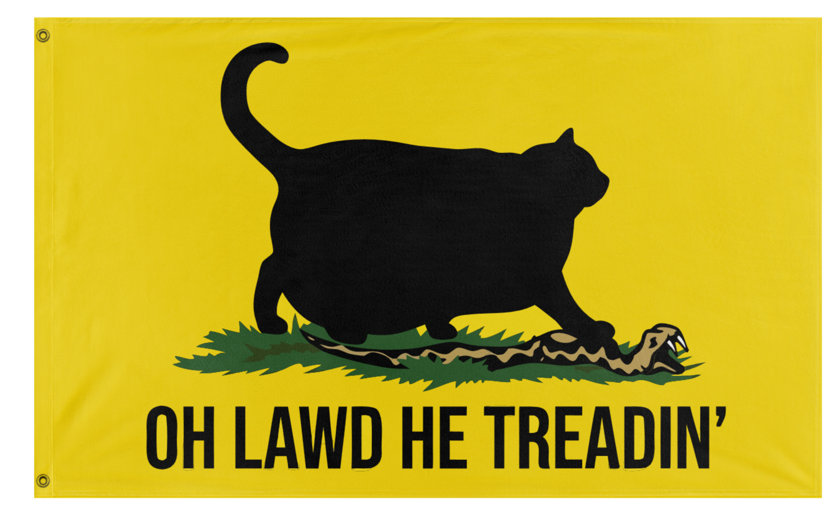 The “Oh Lawd He Treadin’” flag is a parody of the historic Gadsden flag, a prominent American political symbol dating to the American Revolutionary War. The design features a yellow field reminiscent of the original 1775 Gadsden banner, but replaces the coiled rattlesnake and the motto “Don’t Tread on Me” with a silhouetted, highly obese cat stepping on the snake.