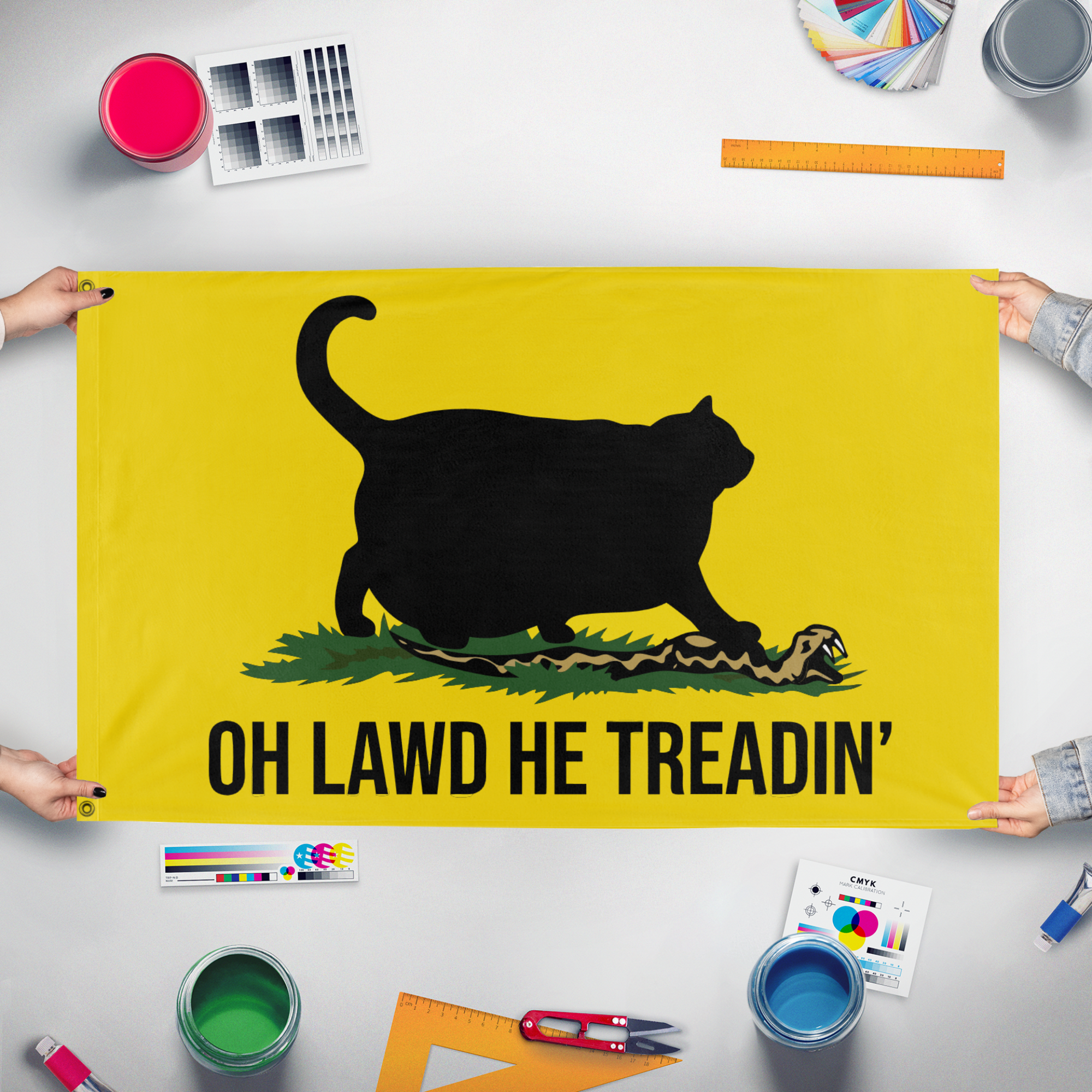 Beneath the illustration appears the caption “OH LAWD HE TREADIN’,” a humorous reference to the viral internet meme phrase “Oh lawd, he comin’.” The juxtaposition of the cat trampling the snake serves as satirical commentary on libertarian and anti-authoritarian symbolism traditionally associated with the Gadsden flag.