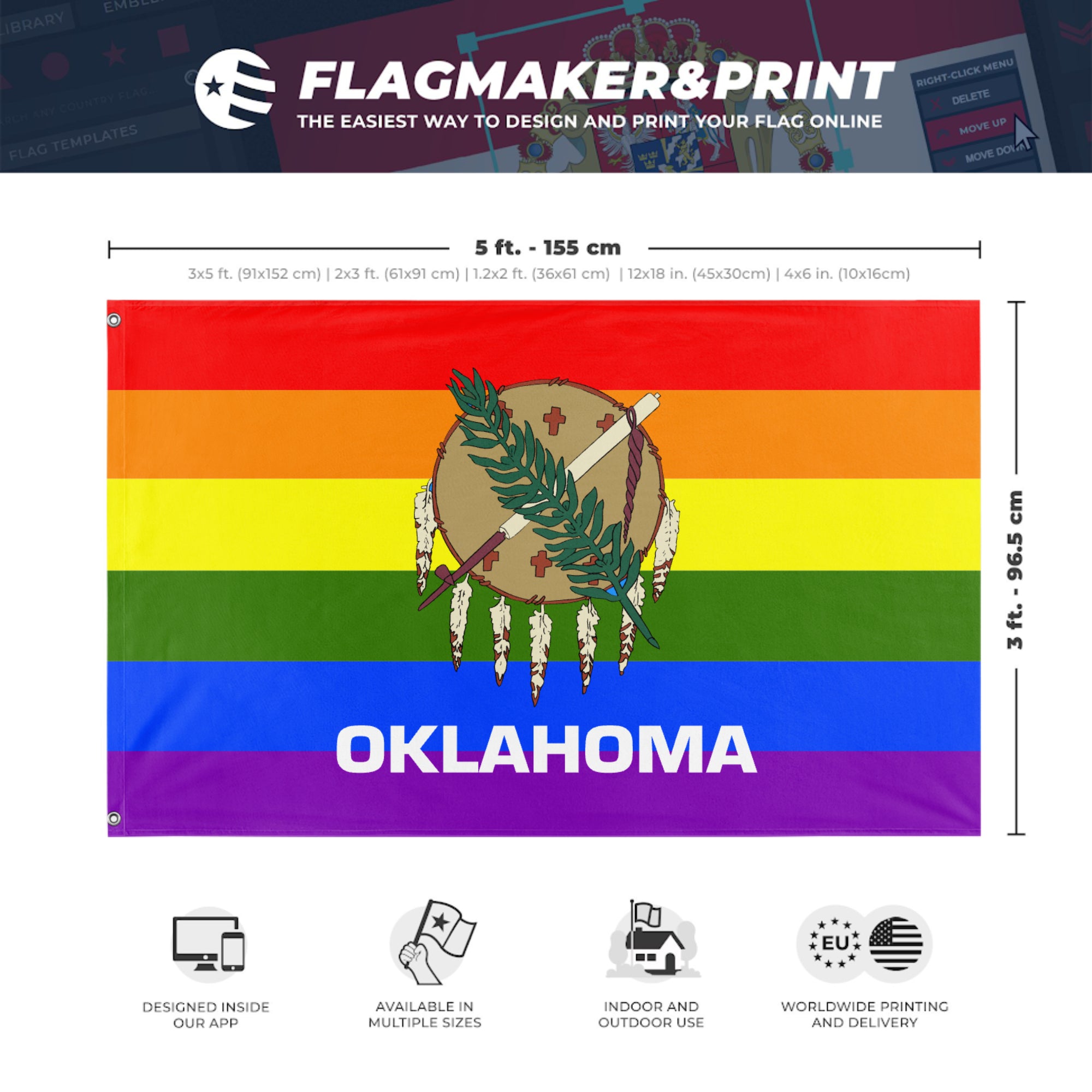 Our integrated flag maker app allows anyone to design and print their own flag. After finishing your design, you can print your flag in three easy steps.