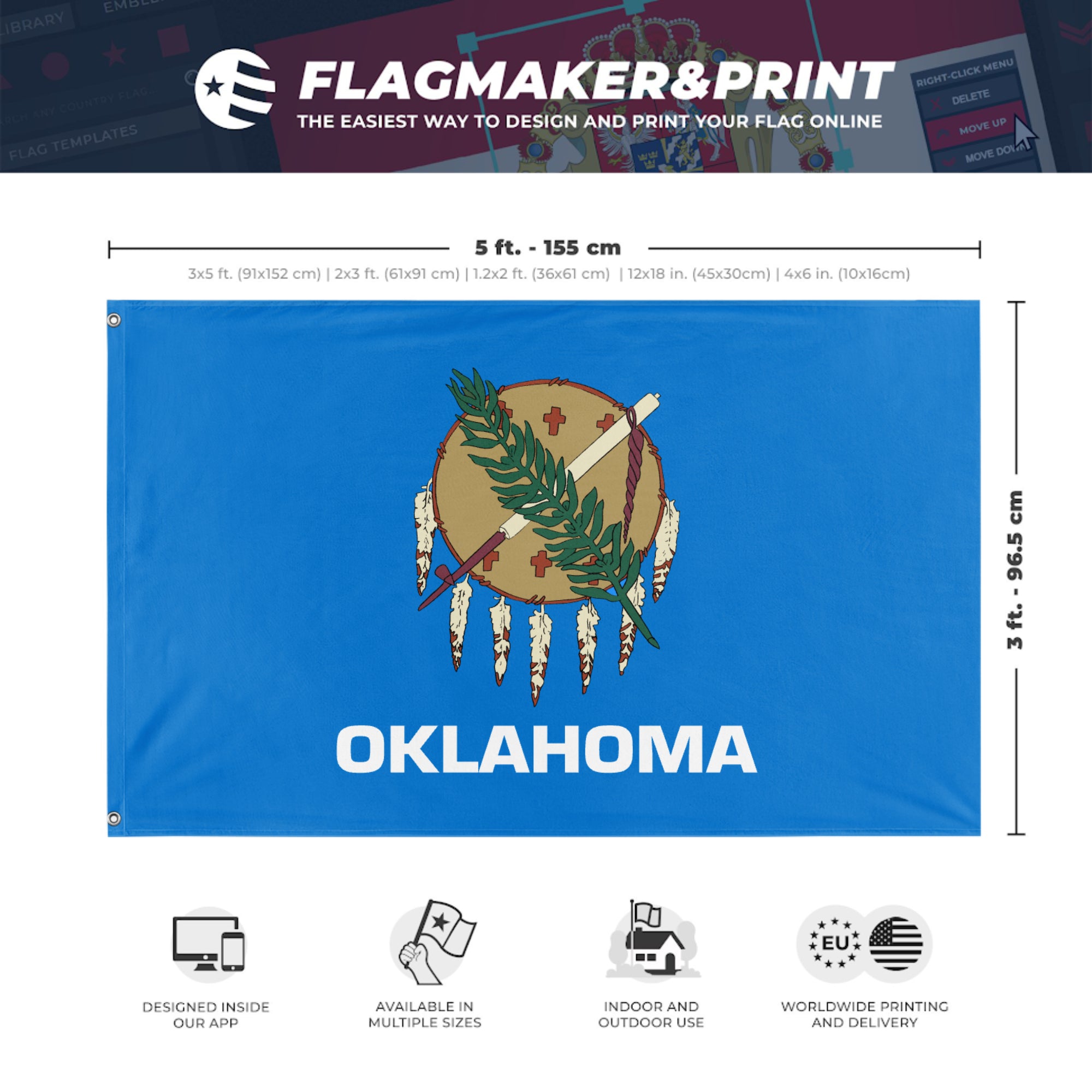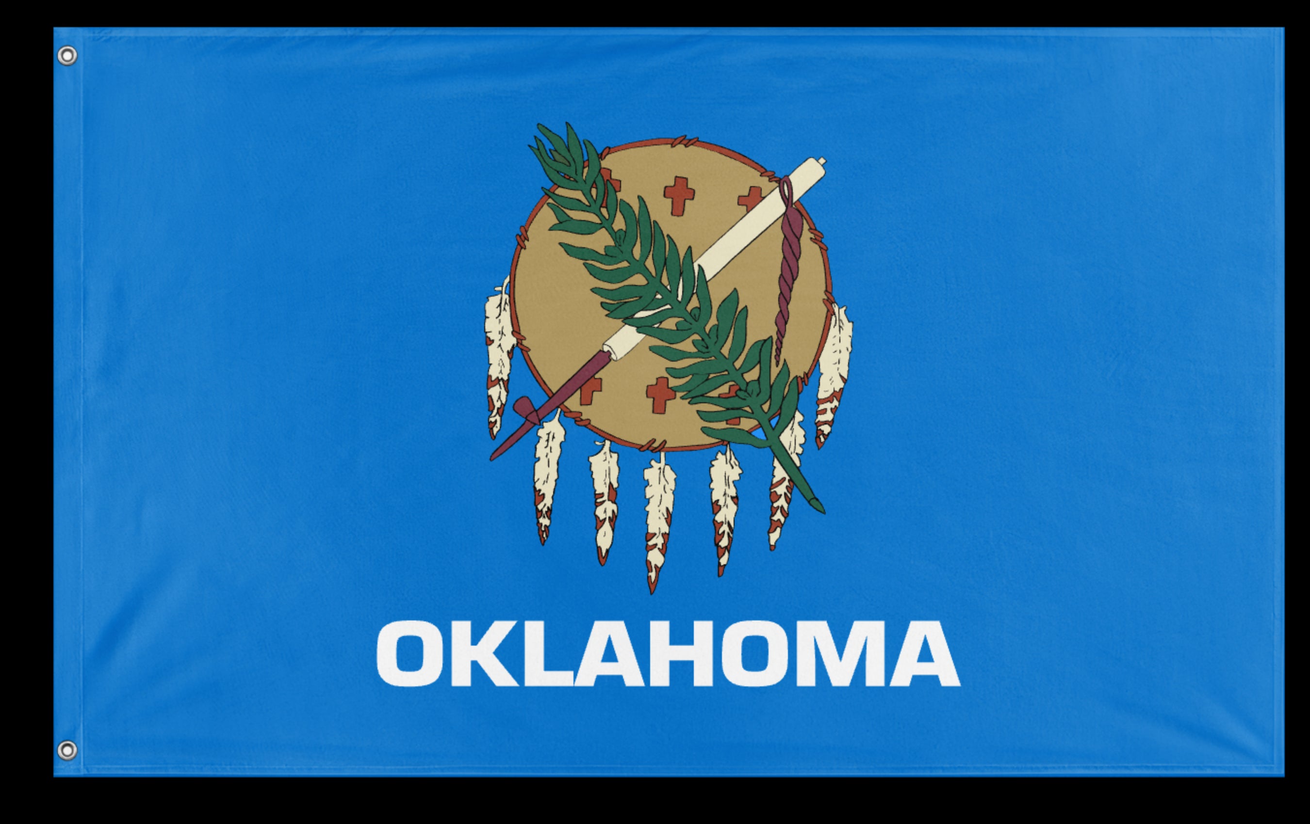✒️ The flag of Oklahoma features a sky blue field with an Osage warrior’s shield made of buffalo hide at its center, adorned with seven eagle feathers hanging from the bottom. Across the shield are a calumet (peace pipe) and an olive branch, symbolizing peace between Native American tribes and European settlers. The blue background represents devotion and loyalty. Adopted in 1925, the flag reflects Oklahoma’s Native American heritage and its commitment to peace and unity.