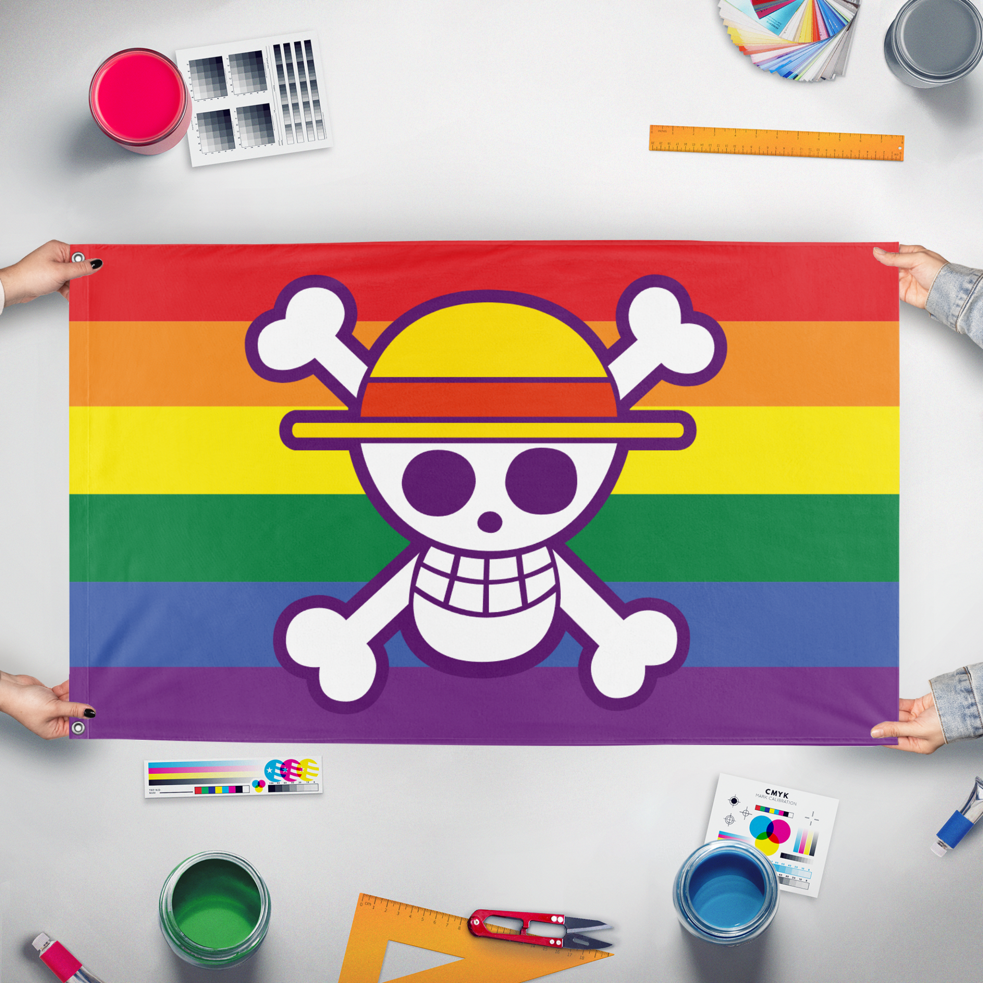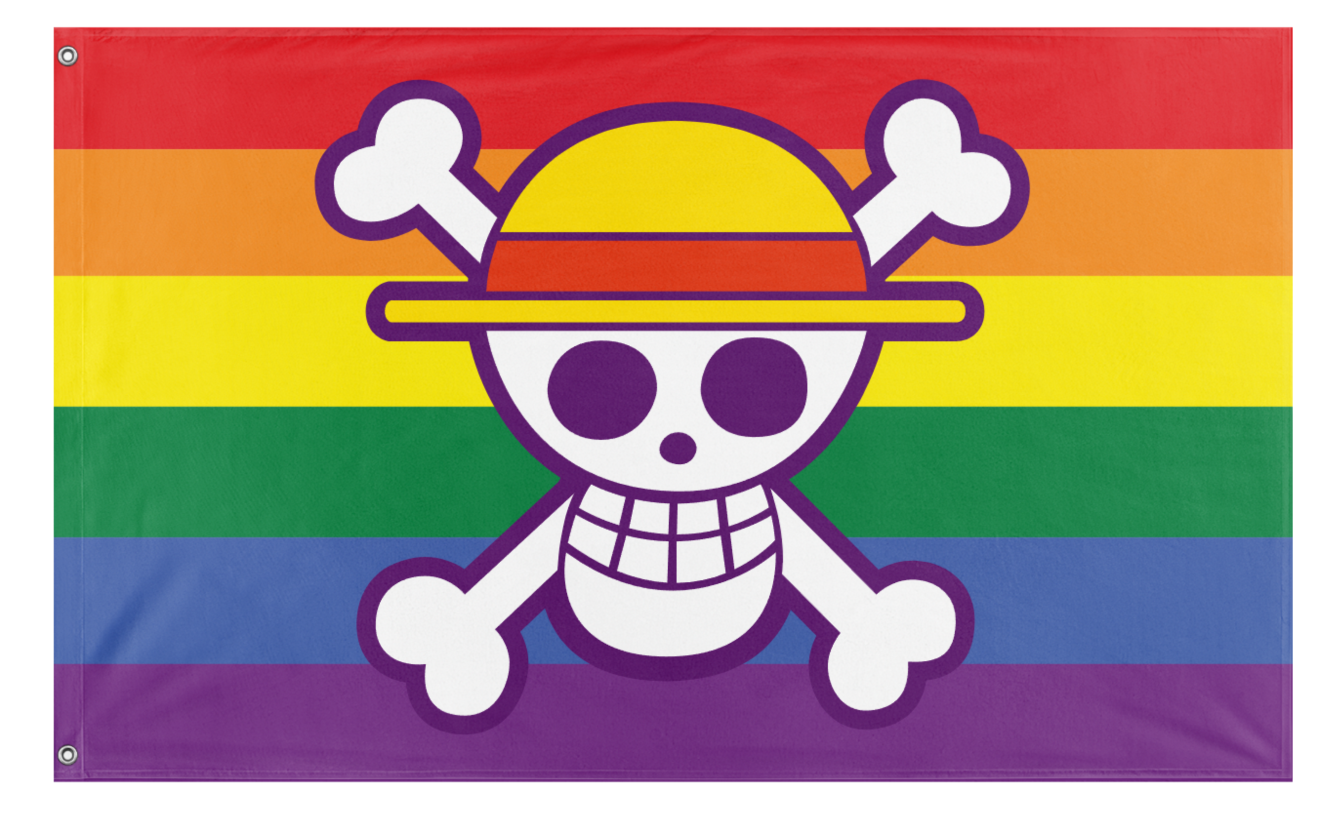 ✒️ The One Piece Pride Flag is a contemporary hybrid flag design that has gained popularity within online communities and fan spaces. The design prominently features the Jolly Roger of the Straw Hat Pirates from the highly successful Japanese anime and manga series, One Piece, superimposed over the six-stripe LGBTQ+ Pride flag. The Straw Hat emblem, a skull wearing Monkey D. Luffy's signature straw hat, is a symbol of freedom, adventure, and rebellion against authoritarianism within the series' narrative. When combined with the rainbow flag, a global symbol of lesbian, gay, bisexual, transgender, and queer (LGBTQ+) pride and social movements, this flag creates a powerful message of inclusive rebellion and the celebration of chosen family—a core theme in the One Piece saga. While the flag does not have a single official origin, it emerged organically from fan culture, particularly among younger audiences and Gen Z. Its history is rooted in the digital age, spreading through social media, fan art, and online forums as a way for individuals to express their intersecting identities as both fans of the series and members or allies of the LGBTQ+ community. The flag is a notable example of modern fandom's practice of remixing pop culture iconography to create new symbols for personal and political expression. It is frequently used in online profiles, at anime conventions, and during Pride Month celebrations, signifying a welcoming and accepting space within the One Piece fandom.