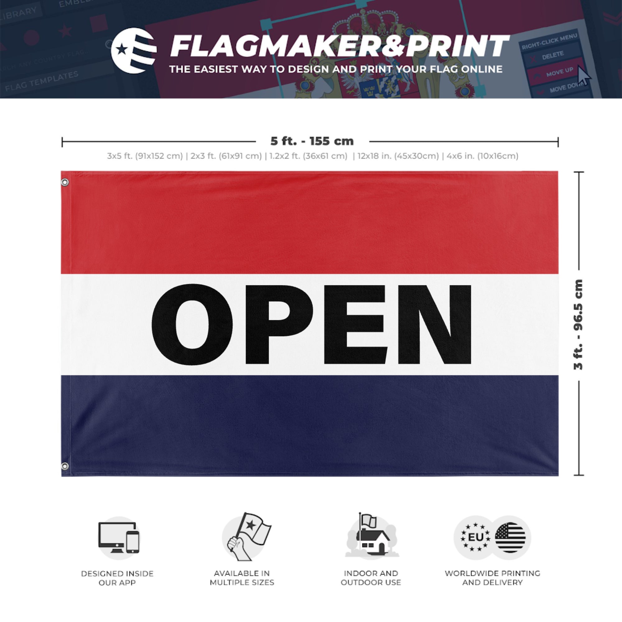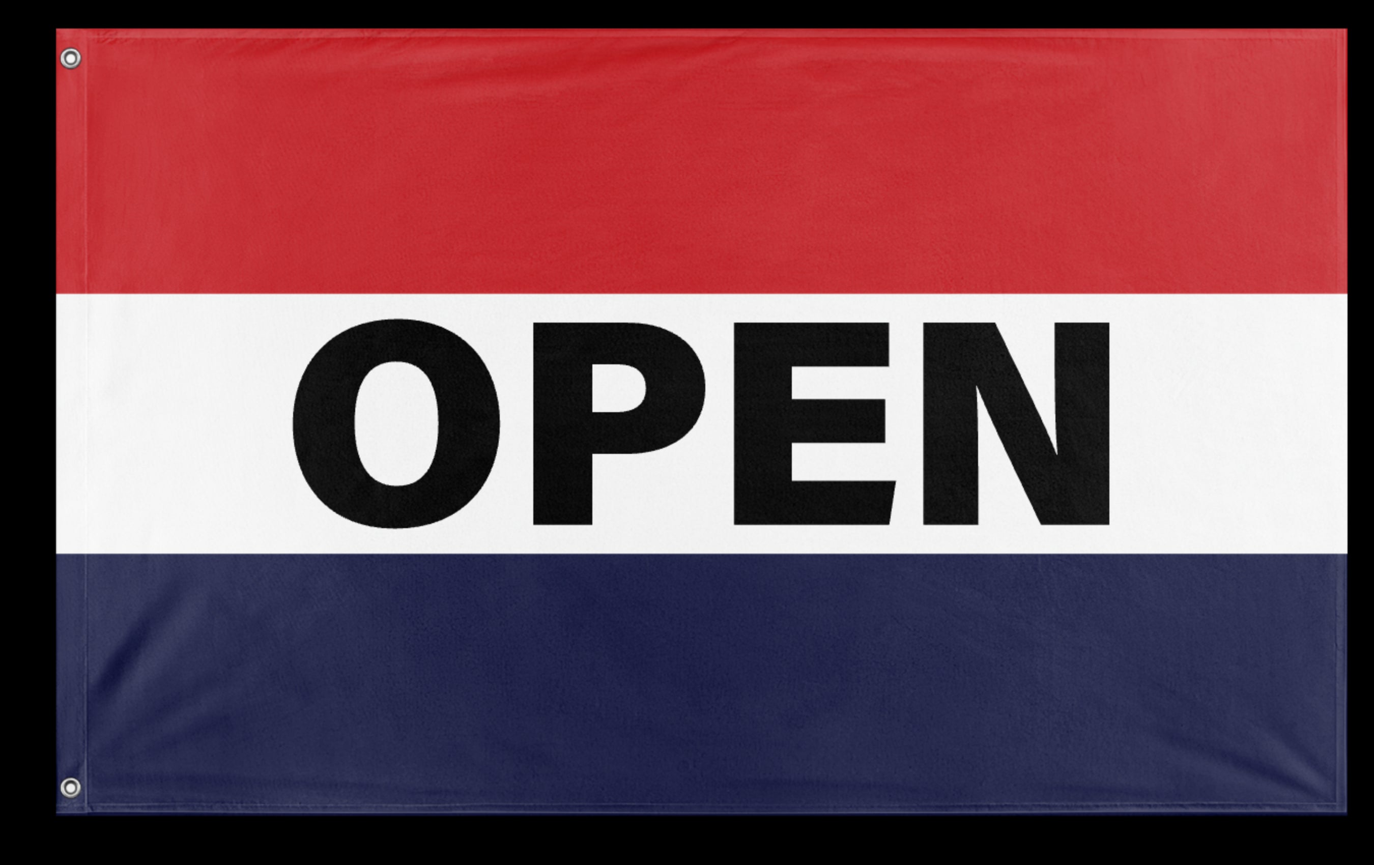 ✒️ The Open Flag is a commercially used sign or banner typically displayed by businesses to indicate that they are open and ready to serve customers. Often featuring the word "OPEN" in bold, capitalized letters, the flag is commonly designed with bright, attention-grabbing colors such as red, white, and blue or other high-contrast combinations to ensure visibility from a distance. It may be mounted on a pole, hung in a window, or placed outside the establishment. Widely recognized in retail and service industries, the Open Flag serves as a simple yet effective visual cue to attract foot traffic and signal operating status to the public.