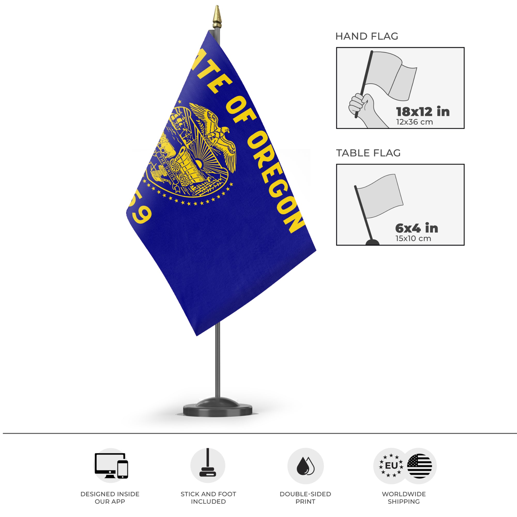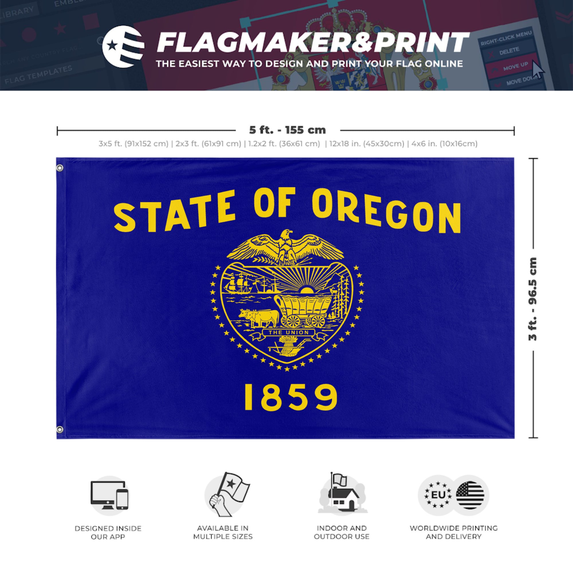 ✒️ The flag of Oregon is unique among U.S. state flags for having different designs on its two sides. The obverse side features a navy blue field with the word “Oregon” above a gold shield displaying a heart-shaped emblem that includes a covered wagon, a pioneer, mountains, forests, and the Pacific Ocean, symbolizing the state’s history and natural landscape. Thirteen stars encircle the shield, representing the original colonies. The reverse side displays a gold silhouette of a beaver, the state animal. Adopted in 1925, Oregon’s flag reflects the state’s pioneer heritage and its significance in the American West.