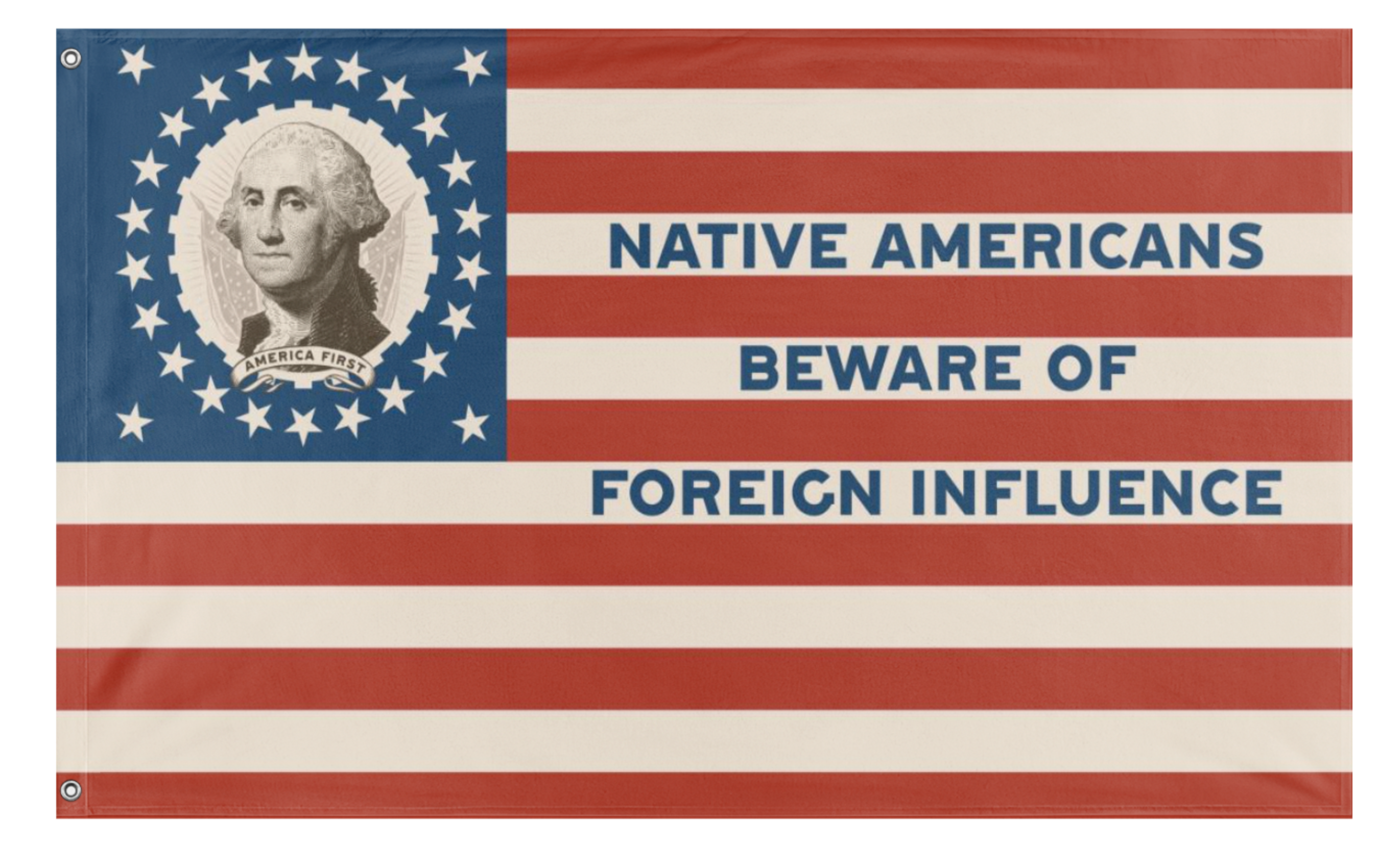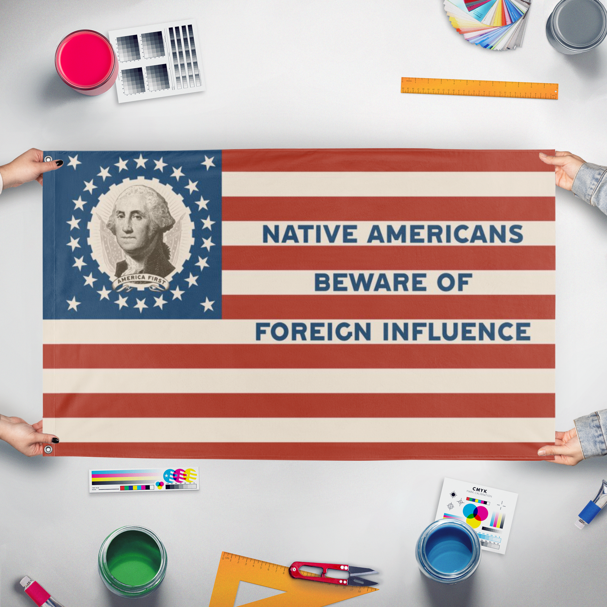✒️The Original Nativist Party Flag is a stylized political banner modeled on the visual conventions of mid-19th century American nativist movements, particularly those associated with the Know Nothing Party. The design adopts the familiar structure of the Flag of the United States, featuring thirteen horizontal red and white stripes representing the original Thirteen Colonies, and a blue canton bearing a circular arrangement of white stars surrounding a central portrait of George Washington. The inclusion of Washington, paired with the phrase “America First,” evokes themes of foundational authority and national identity. Across the central stripes, the inscription “NATIVE AMERICANS BEWARE OF FOREIGN INFLUENCE” reflects the exclusionary rhetoric characteristic of 19th-century nativist platforms.