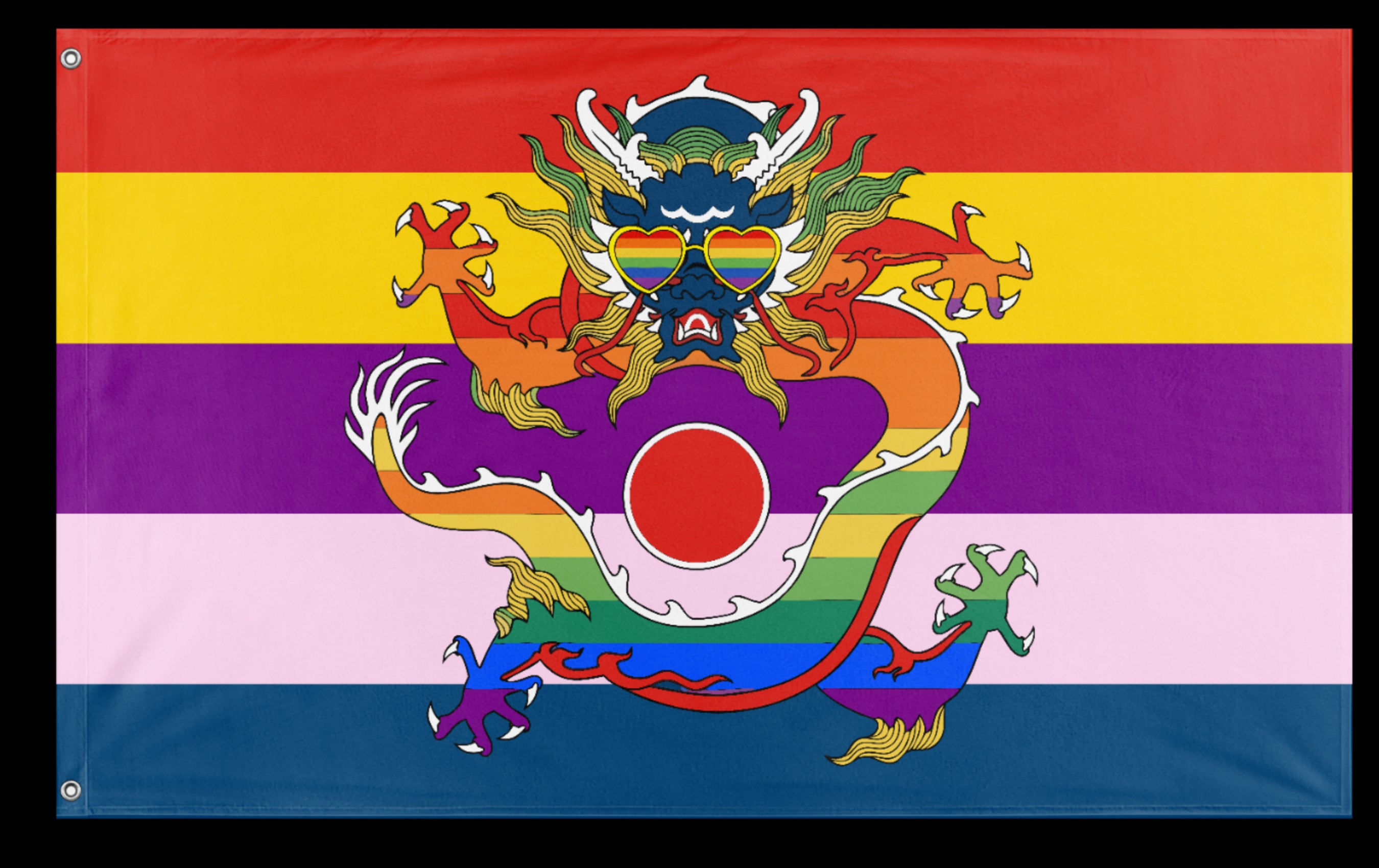✒️ An alternate color pattern version of the Qing Empire Pride Flag. This one uses a more traditional Beiyang Five Colors pattern, but with pink and purple inserted to make the flag resemble a Pride flag more