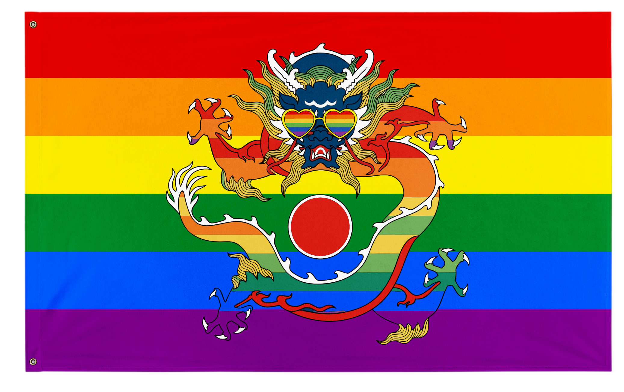 ✒️ The Qing Empire Pride Flag is a fictional, alternative history (alt-history) flag design that combines the emblems of Imperial China with the modern LGBTQ+ pride flag. The design consists of the six-color rainbow pride flag (red, orange, yellow, green, blue, and violet) serving as the field. Superimposed over this background is a large, traditional Chinese dragon, a potent symbol of imperial power, particularly associated with the Qing dynasty. The heraldic dragon is depicted in vibrant colors, coiling around a central red pearl, creating a synthesis of contemporary political identity and historical Chinese heraldry.