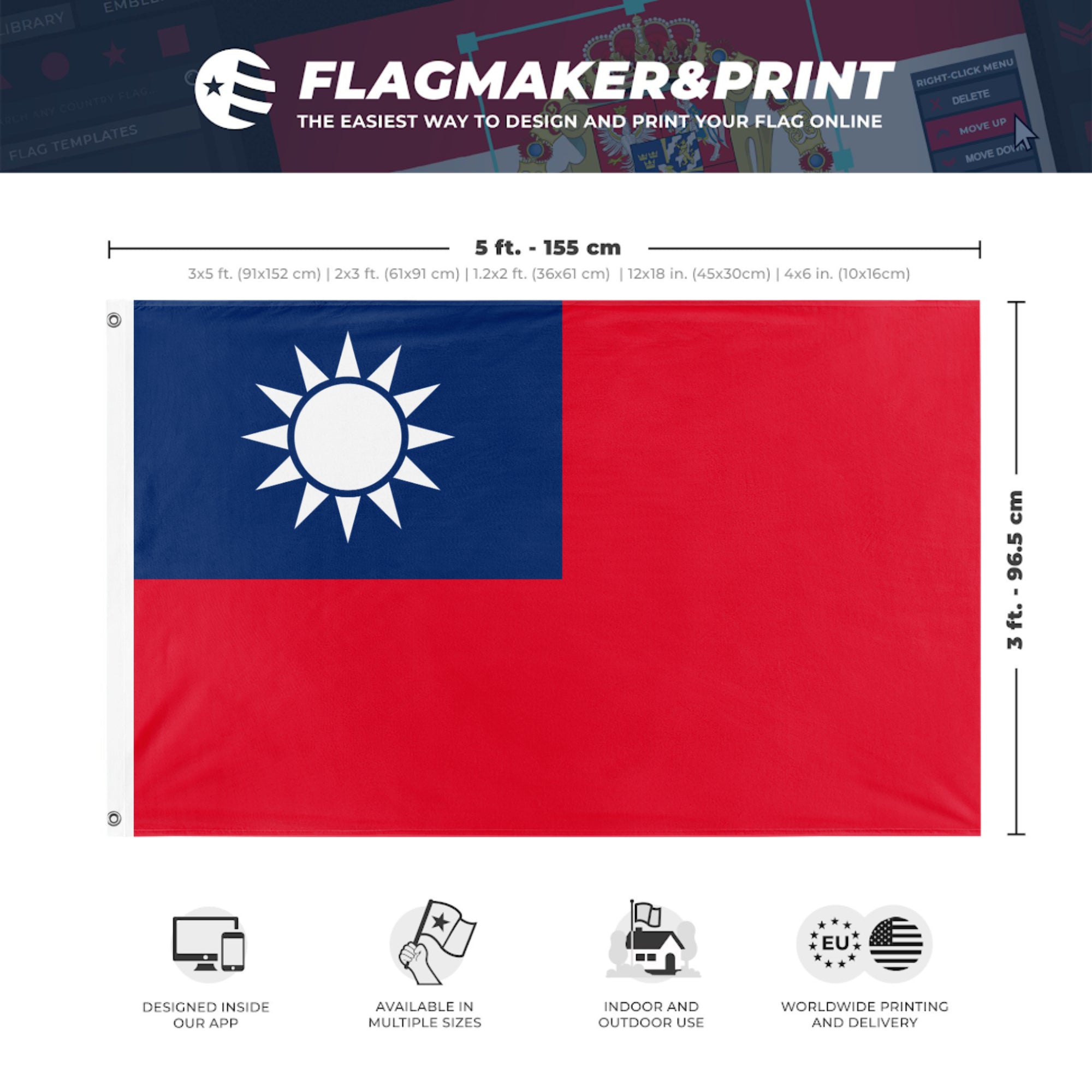 Our integrated flag maker app allows anyone to design and print their own flag. After finishing your design, you can print your flag in three easy steps.