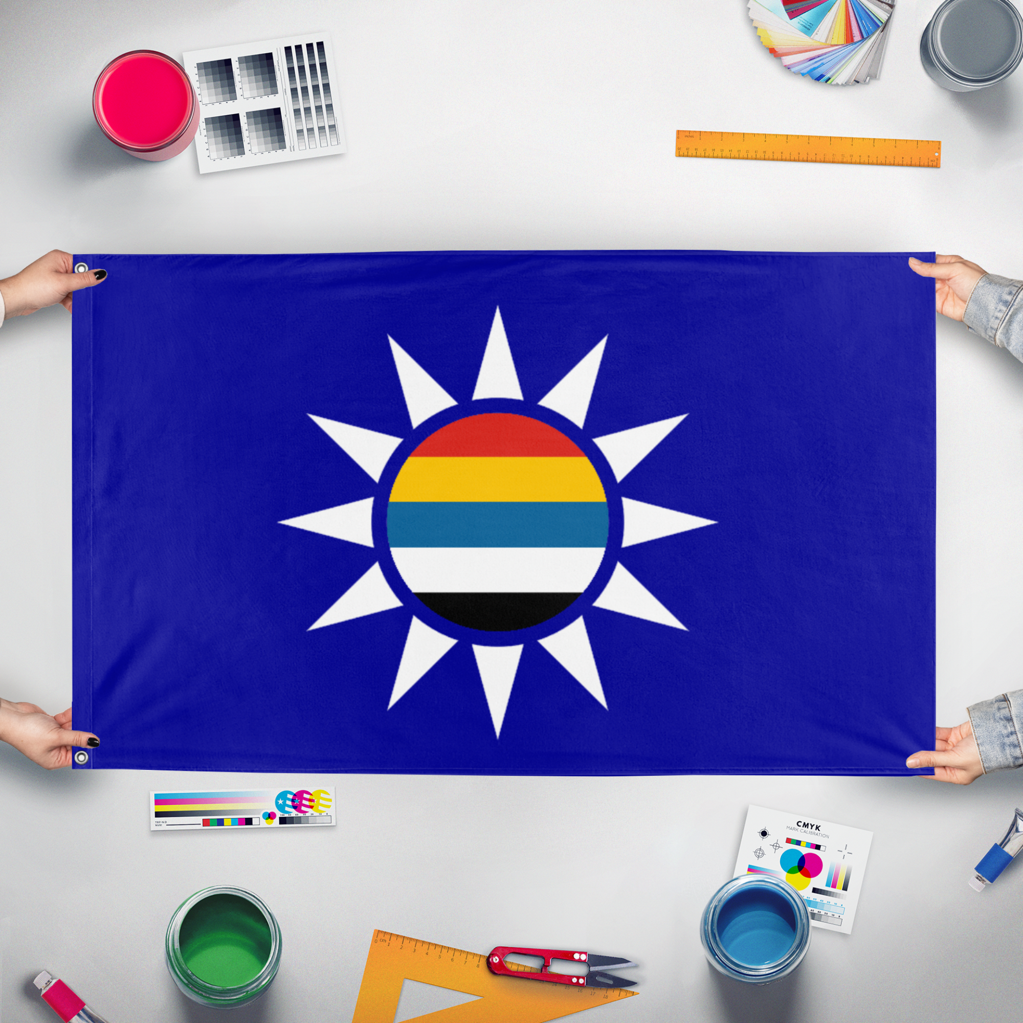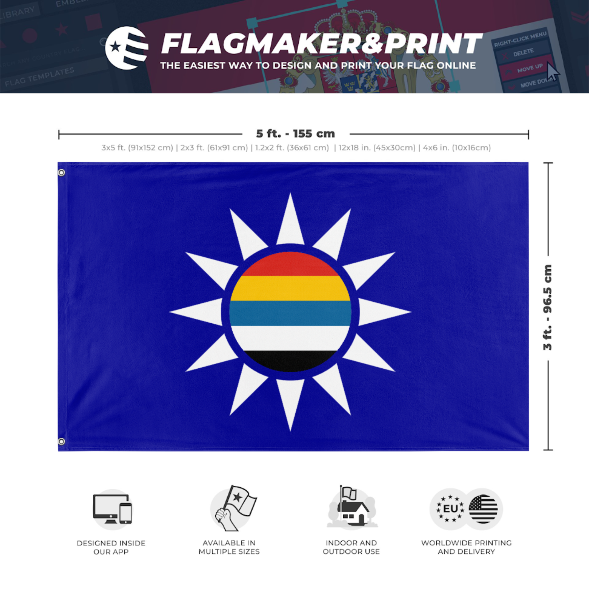 Our integrated flag maker app allows anyone to design and print their own flag. After finishing your design, you can print your flag in three easy steps.