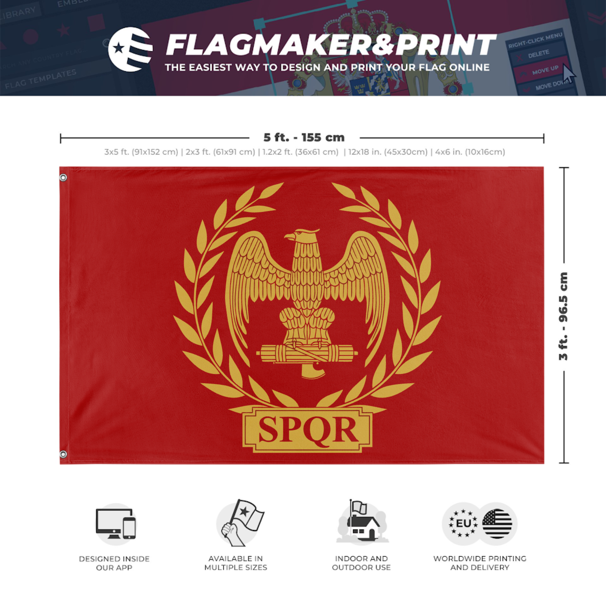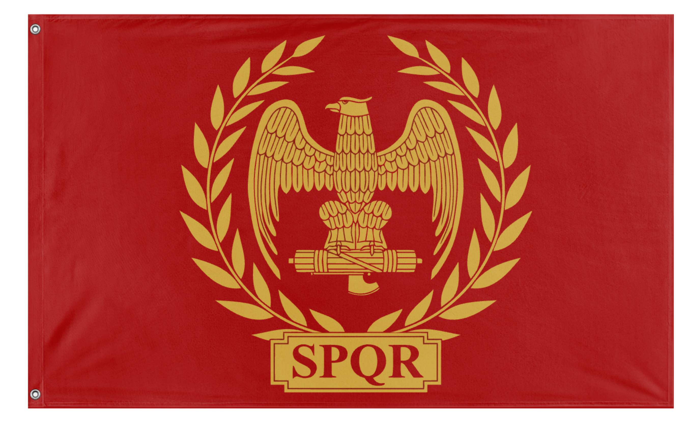 Historically, Rome did not employ a single national flag in the modern sense; instead, symbols such as the aquila, SPQR, and vexilla (military standards) conveyed political and military identity. The imagery represented on this flag synthesizes those ancient symbols into a coherent modern design commonly used to represent the Roman Republic and, by extension, the Roman Empire in historical reconstructions, educational contexts, and popular culture. The red and gold color scheme reflects colors traditionally associated with Roman military standards and imperial authority, while the combination of the eagle, laurel wreath, and SPQR has become one of the most recognizable visual representations of ancient Rome.