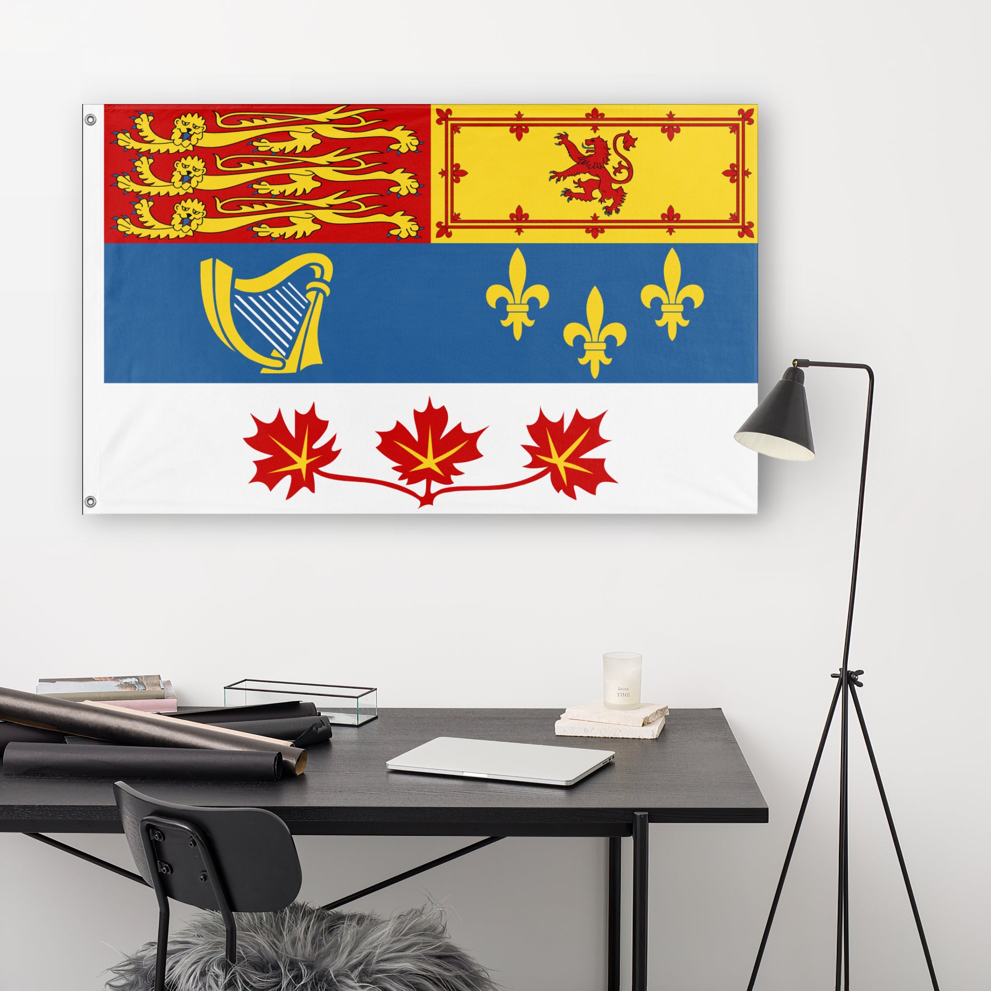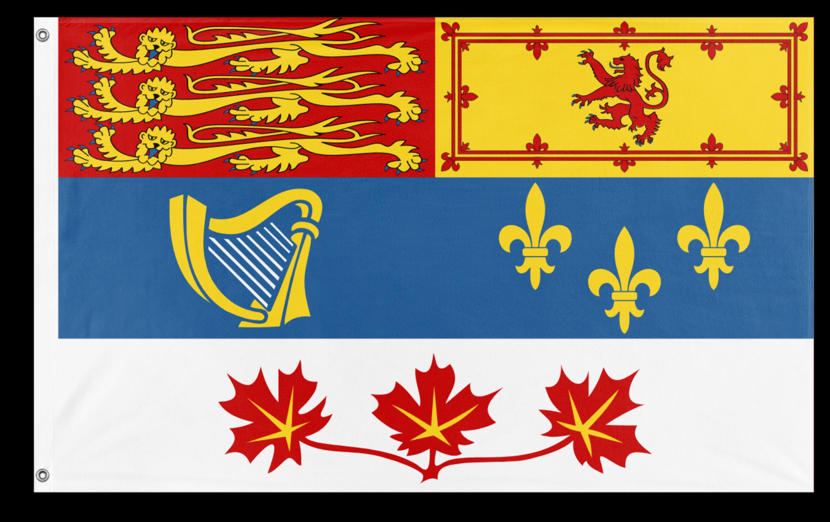 ✒️ The Royal Standard of Canada is the official flag used by the Sovereign of Canada, representing the personal standard of the monarch when in Canada. This version of the flag features a quartered banner that incorporates symbols reflecting Canada’s historical ties to the British monarchy and its cultural diversity. The top left quadrant displays three gold lions passant on red, representing England. The top right quadrant features a red lion rampant within a double tressure on gold, representing Scotland. The bottom left shows a gold harp with silver strings on blue, symbolizing Ireland. The bottom right quadrant depicts three gold fleurs-de-lis on blue, reflecting the historical French presence in Canada. Beneath the quartered banner, the flag includes a stylized red maple leaf with three points, flanked by two similar maple leaves joined by a red stem on a white field. This lower section is a uniquely Canadian addition, symbolizing the unity of Canada’s cultural heritage and its identity as a constitutional monarchy. The Royal Standard is flown exclusively to signify the presence of the monarch and is not used as a national flag or by government institutions.