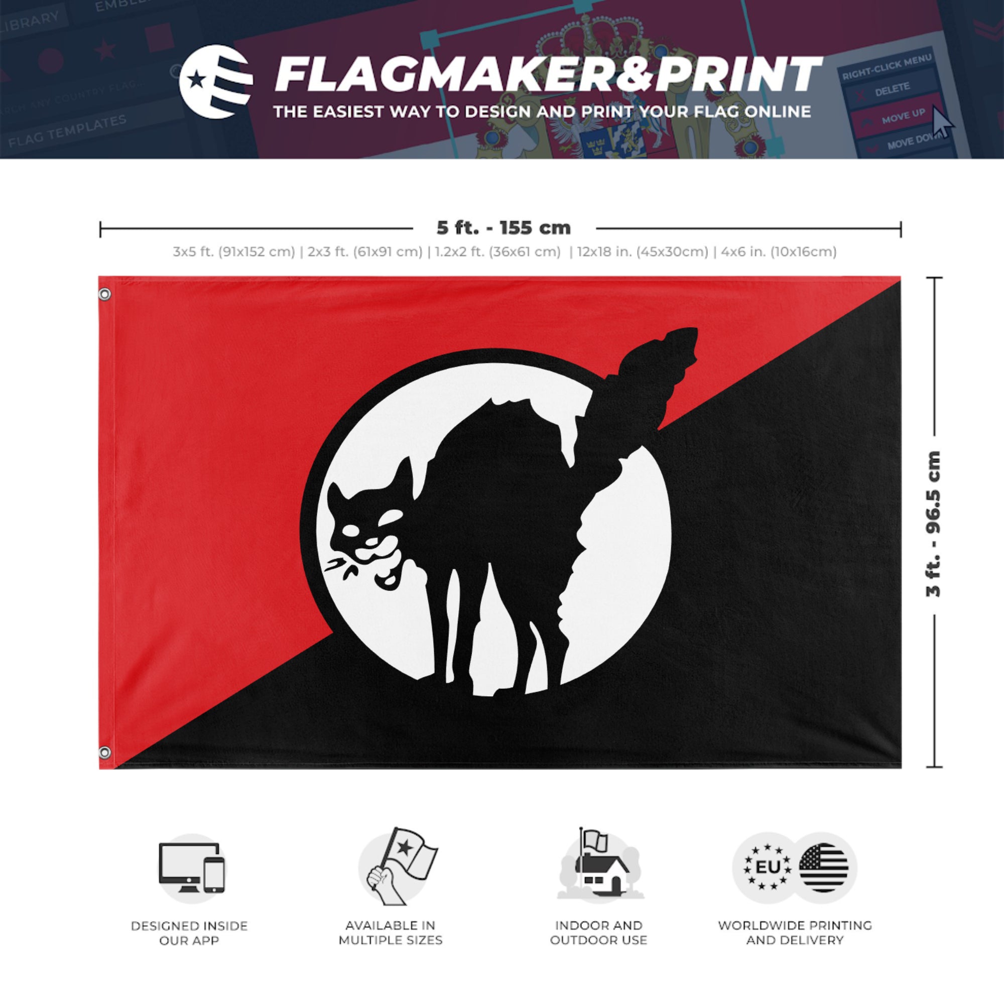 ✒️ The Sabot Cat flag, also recognized as the Sabo-Tabby or the IWW Black Cat, is a prominent symbol within the labor movement, specifically associated with the Industrial Workers of the World (IWW). Visually, the flag features a field bisected diagonally from the bottom left to the top right, displaying the traditional red and black colors of anarcho-syndicalism—where red represents the social labor movement and black represents anarchism. Centered on the flag is a white roundel containing the silhouette of a hissing black cat with an arched back, a pose indicative of defense and aggression. Historically, this icon was created by Ralph Chaplin, a prominent "Wobbly" (IWW member) and illustrator, in the early 20th century. The symbol is deeply rooted in the concept of direct action and sabotage (derived from the French word sabot, referring to workers throwing wooden shoes into machinery to stop production). The cat was originally used to symbolize "wildcat" strikes and served as a superstitious warning that bad luck would befall employers who mistreated workers. Over the last century, the Sabot Cat has endured as a global emblem of radical unionism, workers' rights, and resistance against industrial exploitation.