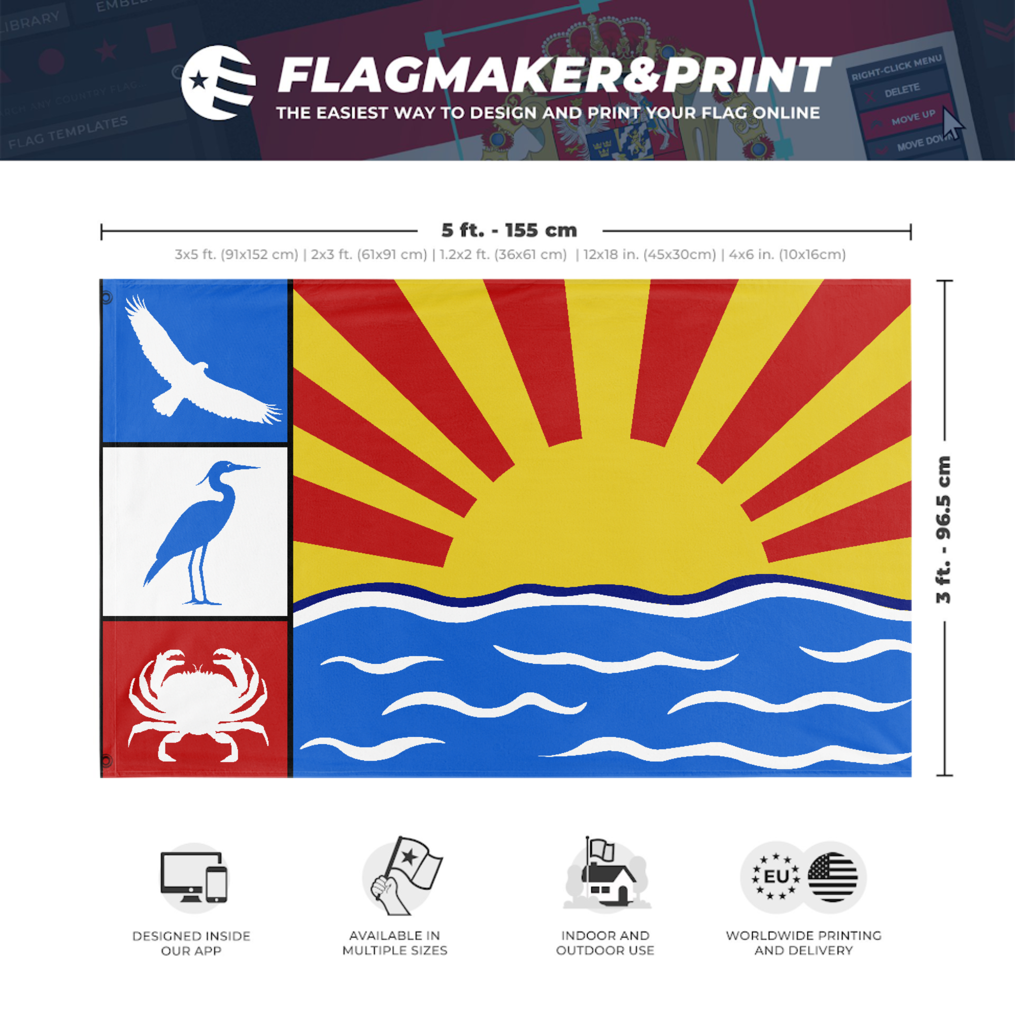 Our integrated flag maker app allows anyone to design and print their own flag. After finishing your design, you can print your flag in three easy steps.