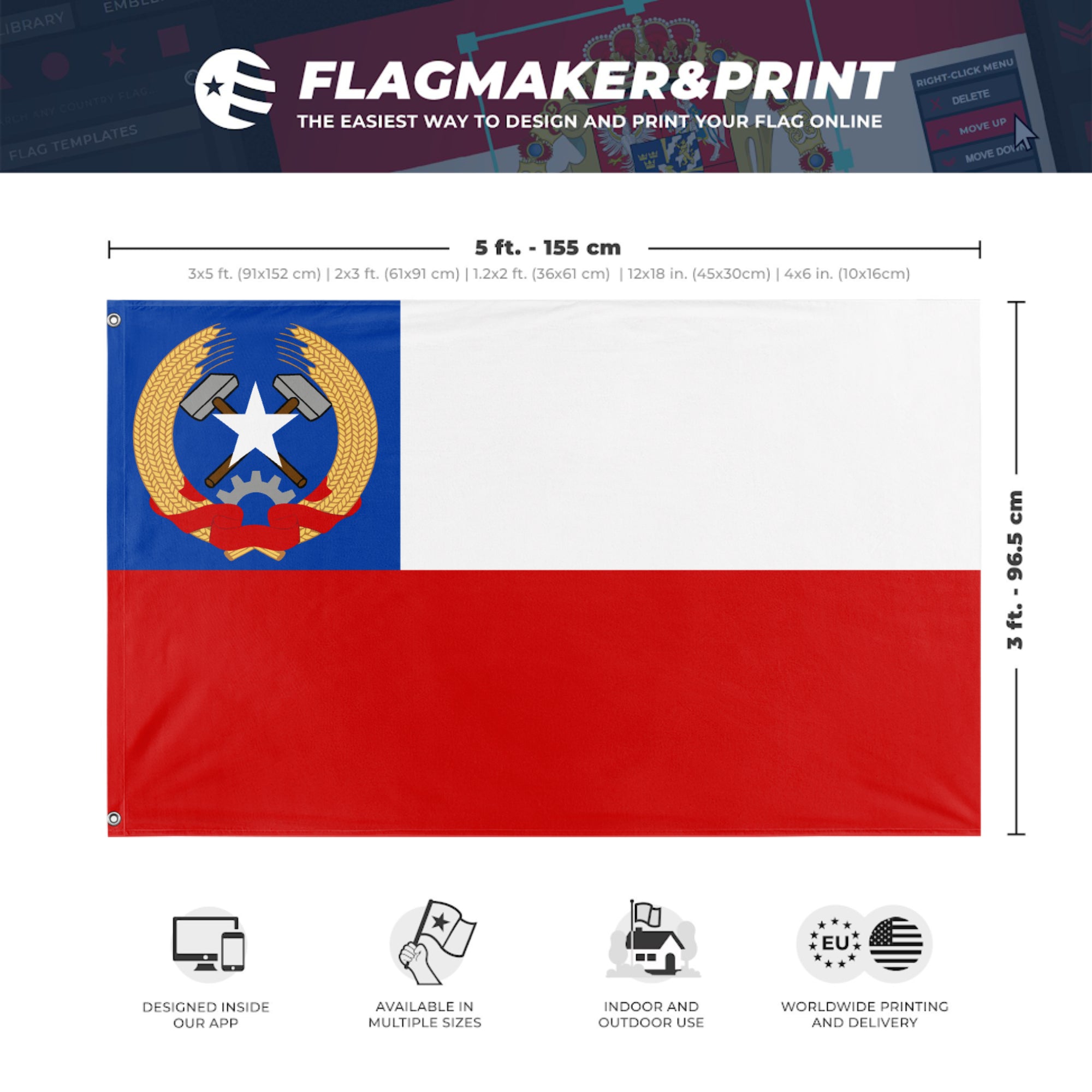 Our integrated flag maker app allows anyone to design and print their own flag. After finishing your design, you can print your flag in three easy steps.