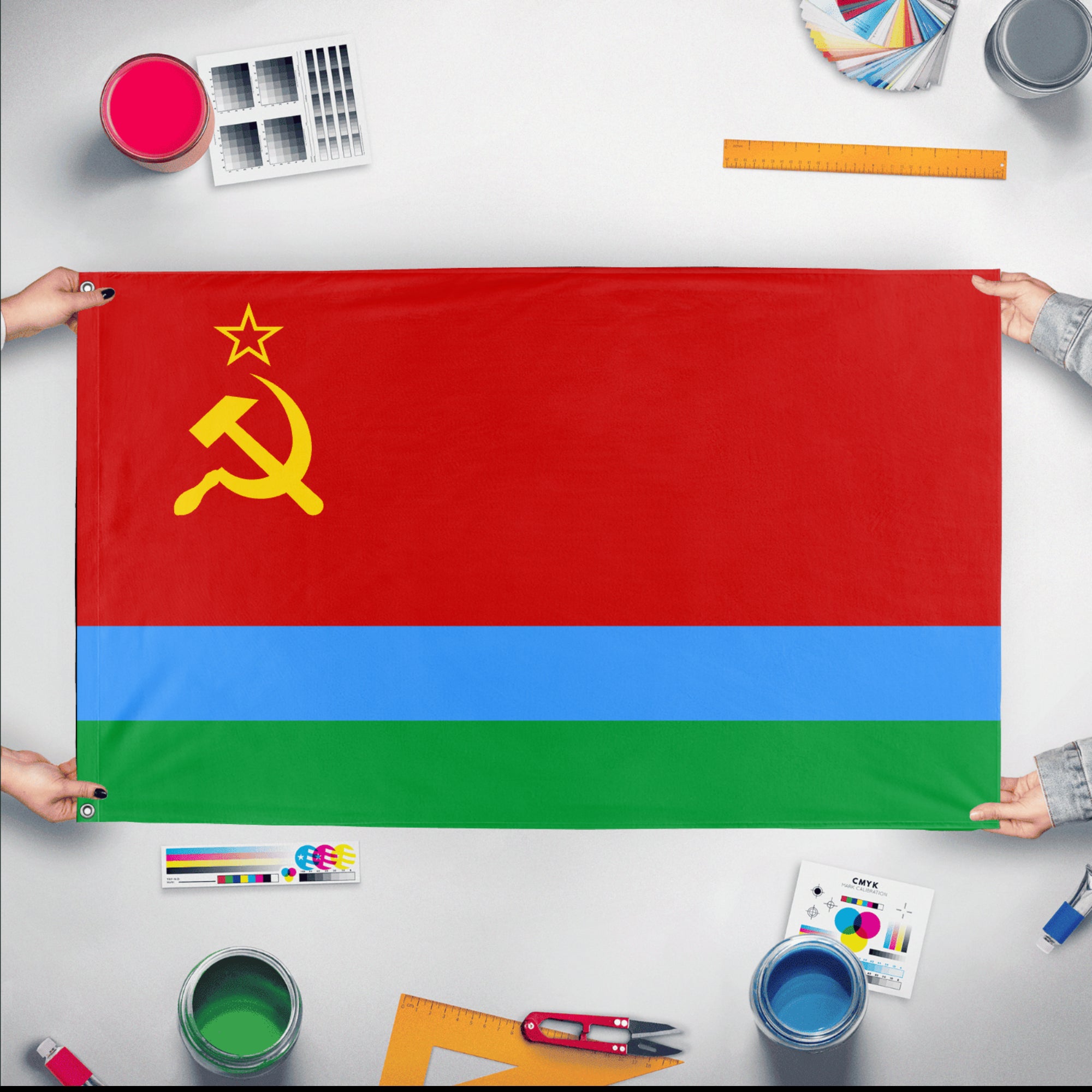 Our integrated flag maker app allows anyone to design and print their own flag. After finishing your design, you can print your flag in three easy steps.