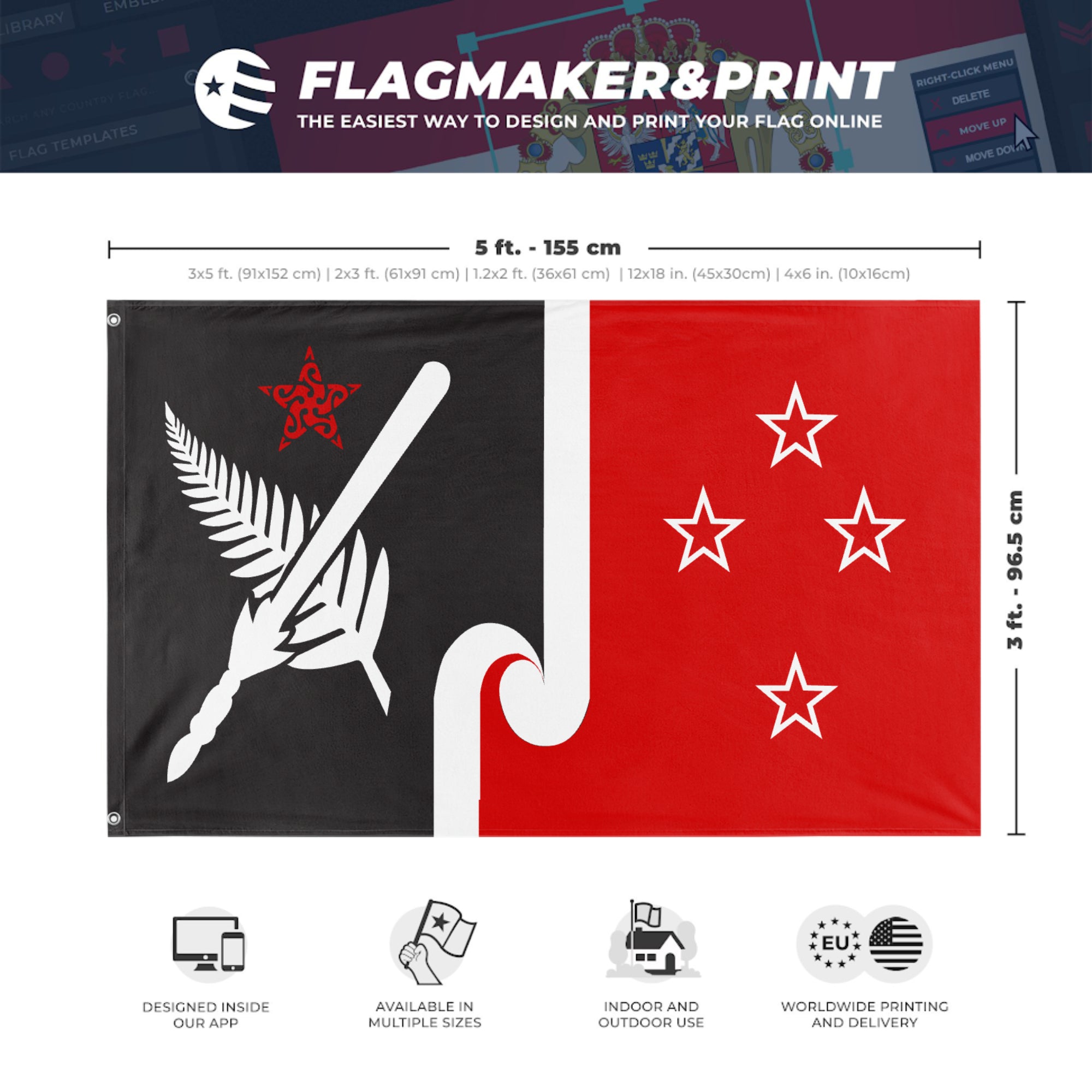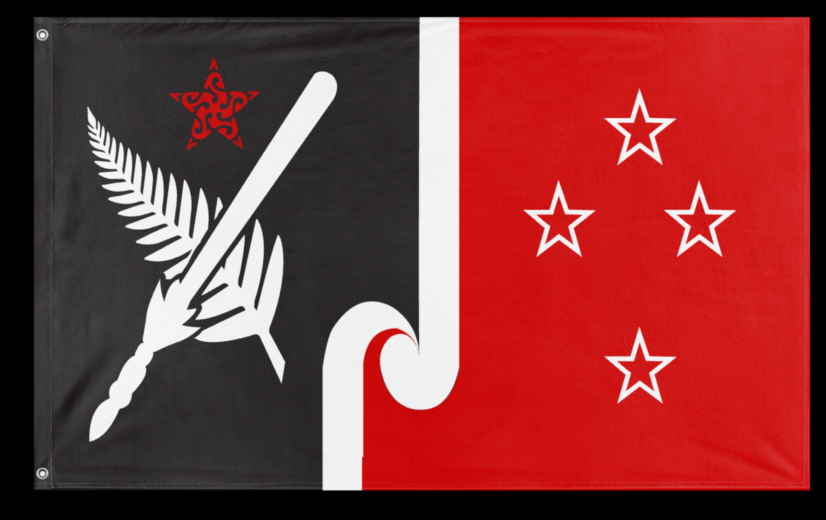 ✒️ The Socialist New Zealand Flag is a conceptual design that reimagines the national flag through a socialist lens. It often replaces traditional colonial elements, such as the Union Jack, with symbols of labor, equality, and solidarity—commonly featuring a red field or red star to represent socialism and workers’ movements. Variations may incorporate local motifs such as the silver fern or Māori-inspired designs to reflect indigenous and national identity alongside socialist ideals. The flag symbolizes a vision of New Zealand grounded in social justice, collective ownership, and political reform, and is typically used in political art, protests, or speculative discussions about alternative governance.