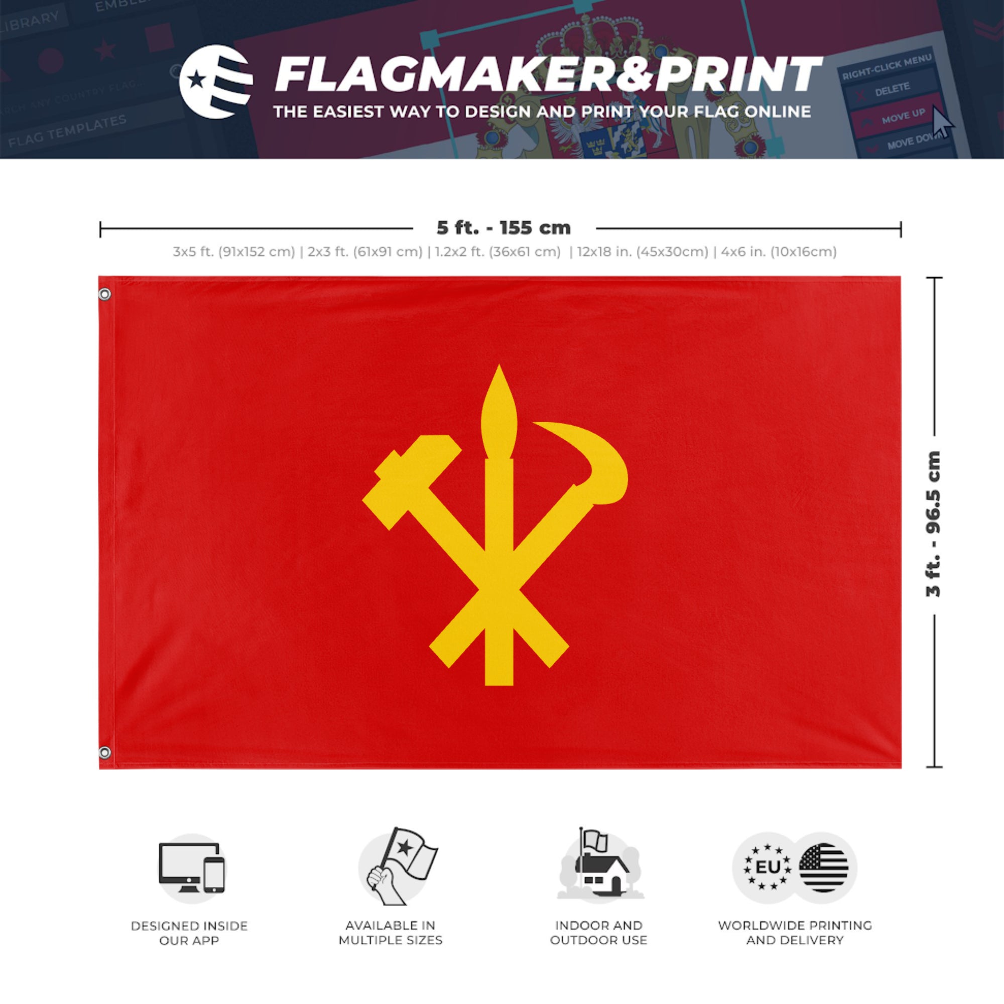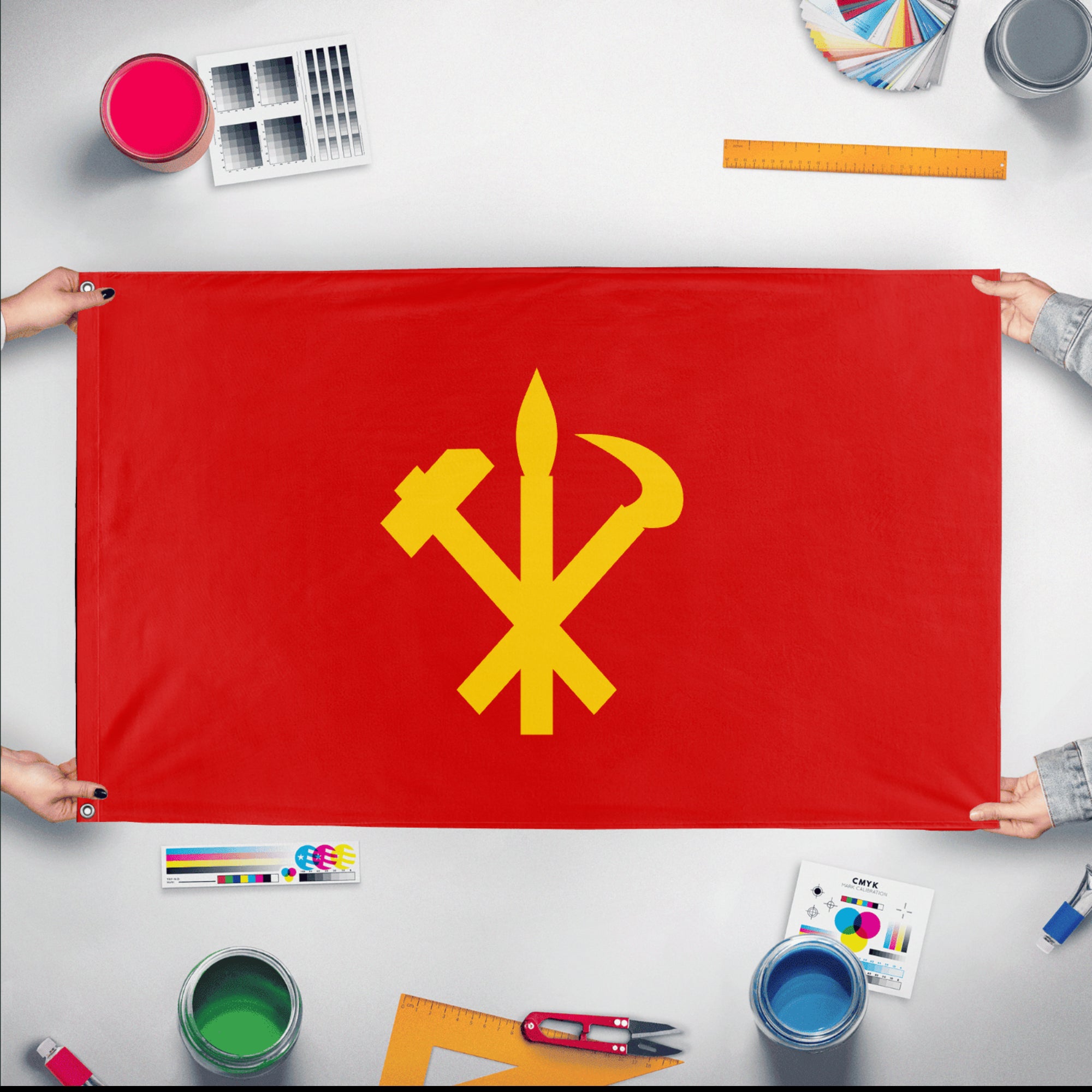 ✒️ The Socialist North Korea Flag, officially known as the national flag of the Democratic People’s Republic of Korea (DPRK), already incorporates strong socialist symbolism rooted in its state ideology of Juche and Marxist-Leninist principles. The flag features a central red field flanked by blue stripes and thin white borders, with a prominent red five-pointed star within a white circle near the hoist. The red symbolizes revolutionary spirit and socialism, the star represents the leadership of the Communist Party, and the blue signifies peace and friendship. Unlike conceptual socialist flags in other countries, North Korea's flag is explicitly designed to reflect its socialist identity and remains a central emblem of the regime’s political philosophy.
