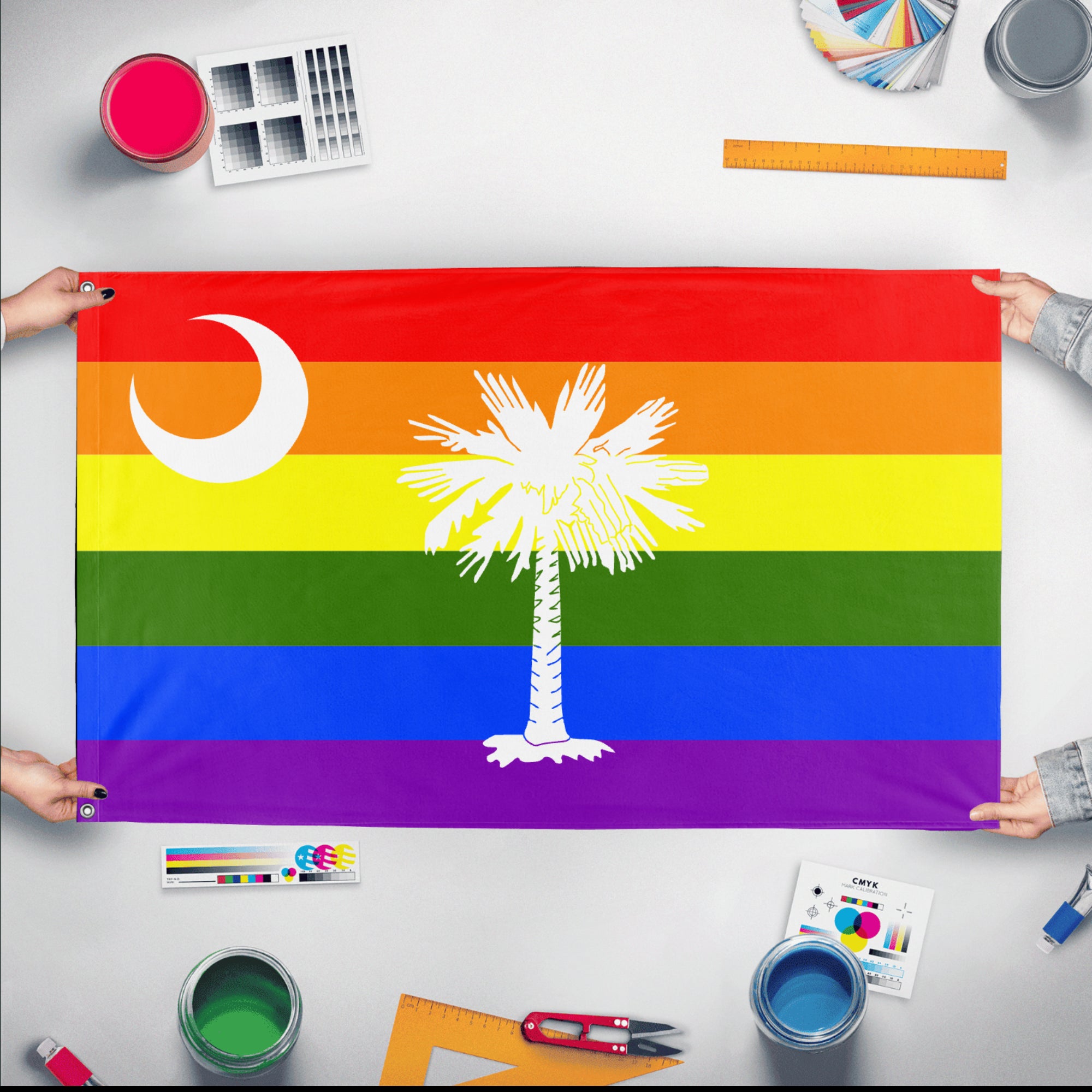 ✒️ The South Carolina Pride Flag Pride Movement is a state-centered initiative that originated in the 2020s with the goal of fostering LGBTQ+ representation and cultural unity through the creation of a pride flag unique to South Carolina. The flag integrates classic LGBTQ+ rainbow motifs with design elements inspired by the state’s iconic palmetto tree and crescent moon, symbolizing resilience, identity, and regional pride. It has become a recognizable emblem during pride parades, advocacy events, and educational programs across the state. The movement continues to support visibility, inclusivity, and equal rights for LGBTQ+ individuals throughout South Carolina.