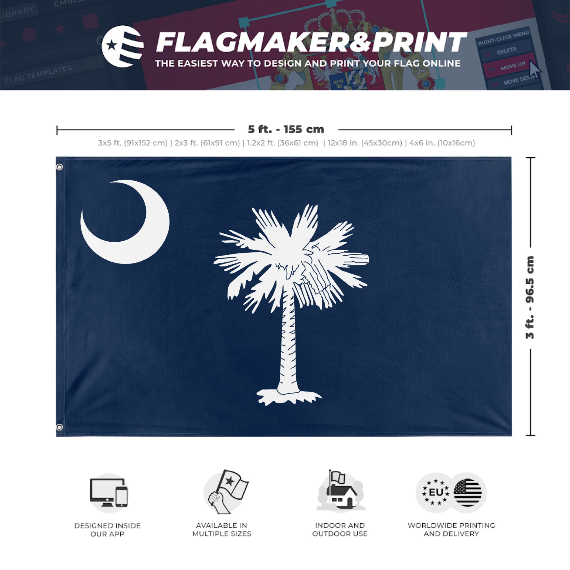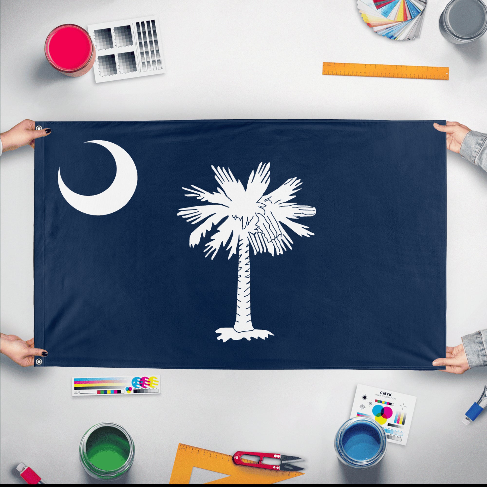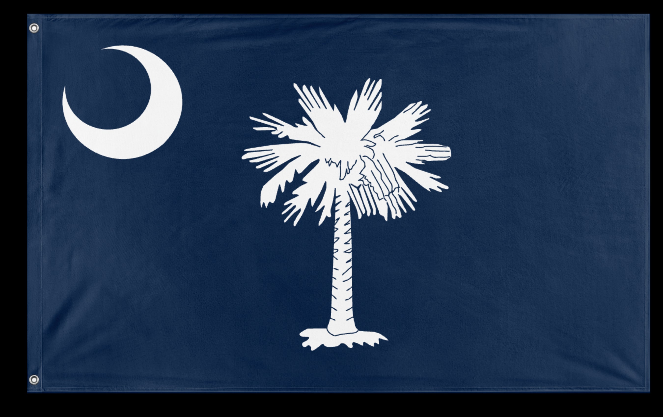 ✒️ The flag of South Carolina features a simple yet iconic design with a deep indigo blue field bearing a white palmetto tree at its center and a white crescent in the upper hoist corner. The palmetto tree symbolizes the defense of the Palmetto Fort during the American Revolutionary War, while the crescent is believed to represent a gorget, a piece of armor worn by South Carolina troops. Adopted in 1861, the flag reflects the state’s history, resilience, and pride.