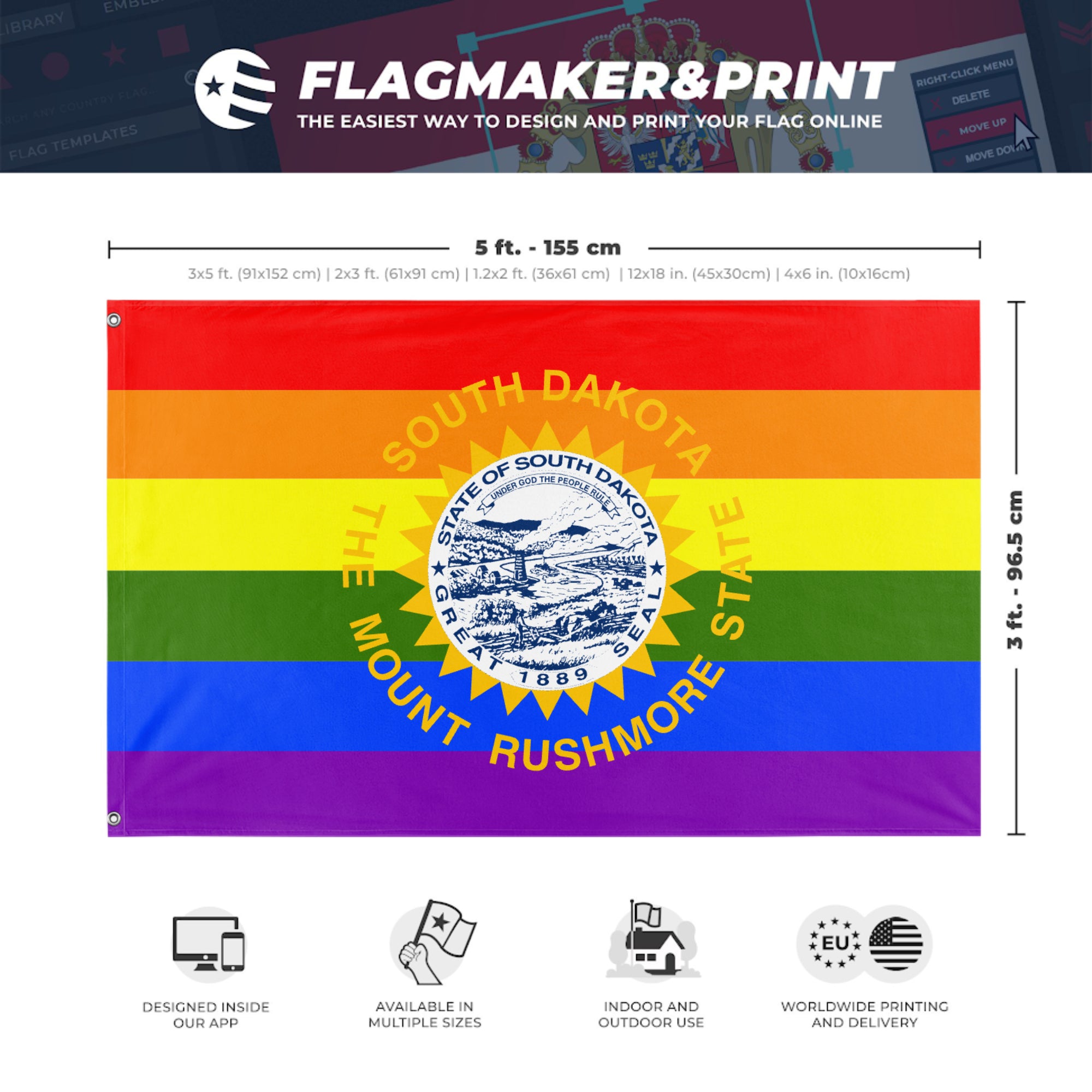 ✒️ The South Dakota Pride Flag Pride Movement is a regional initiative launched in the 2020s to promote LGBTQ+ visibility, solidarity, and cultural recognition across the state of South Dakota. The movement introduced a pride flag that blends the traditional rainbow colors with imagery and design elements reflective of South Dakota’s natural landscapes, Indigenous heritage, and frontier spirit. Serving as a powerful symbol of inclusion and identity, the flag is displayed at pride events, community gatherings, and advocacy efforts throughout the state. The movement continues to advance public awareness, equal rights, and acceptance for LGBTQ+ individuals in both urban and rural communities across South Dakota.