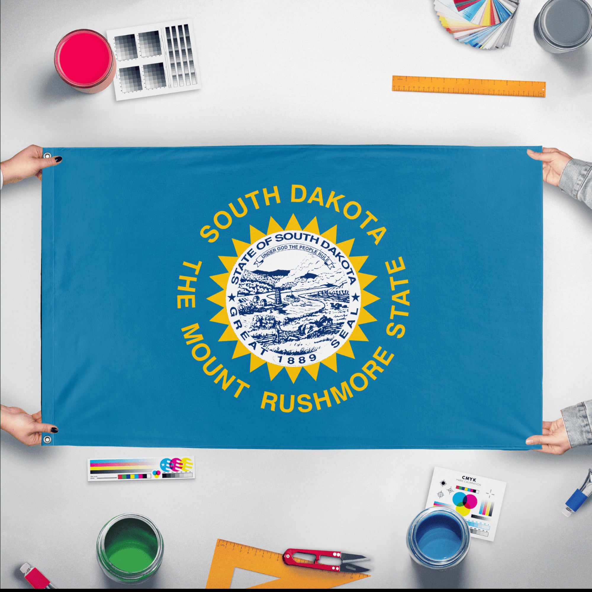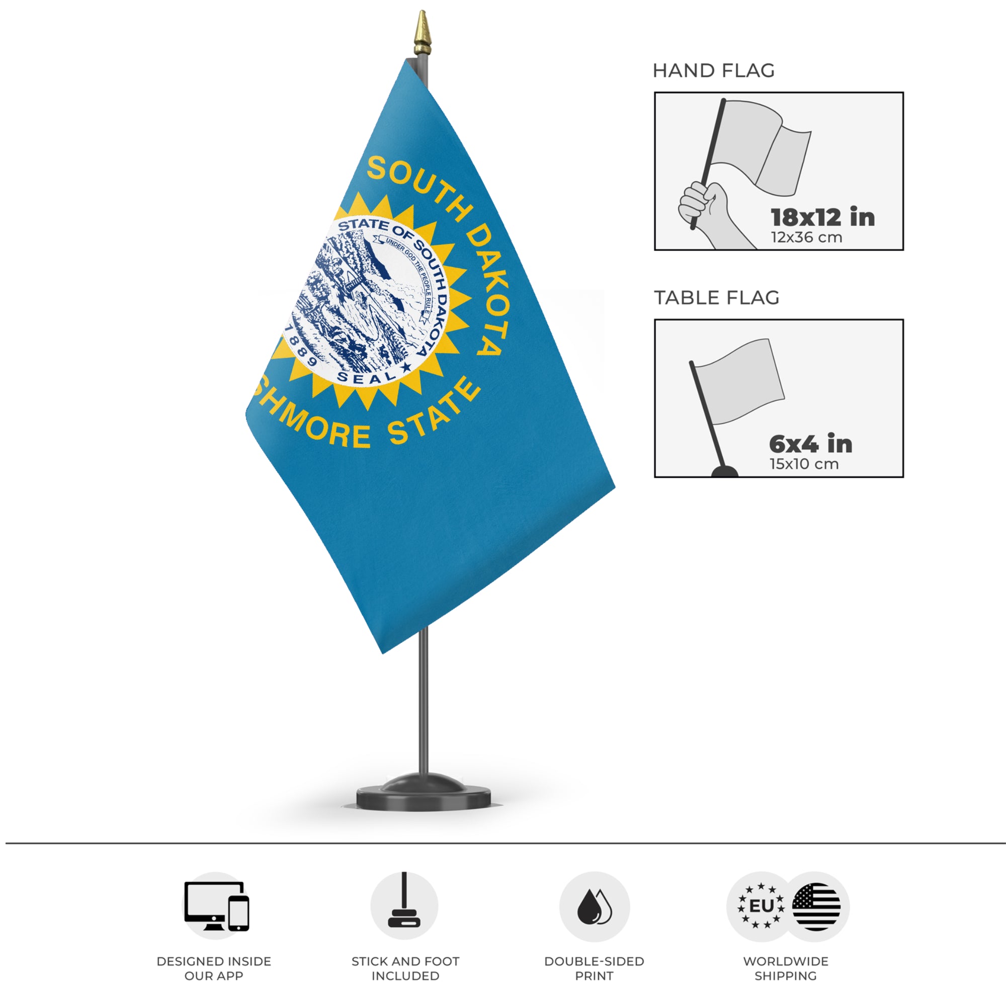 ✒️ The flag of South Dakota features a sky blue field with a central gold sun surrounded by a ring of gold triangles representing the sun’s rays. Encircling the sun is a white band bordered in gold, containing the inscriptions “South Dakota” at the top and the state motto, “The Mount Rushmore State,” at the bottom. Adopted in 1963, the flag symbolizes South Dakota’s natural beauty, heritage, and pride, with the sun and rays highlighting the state’s bright future.