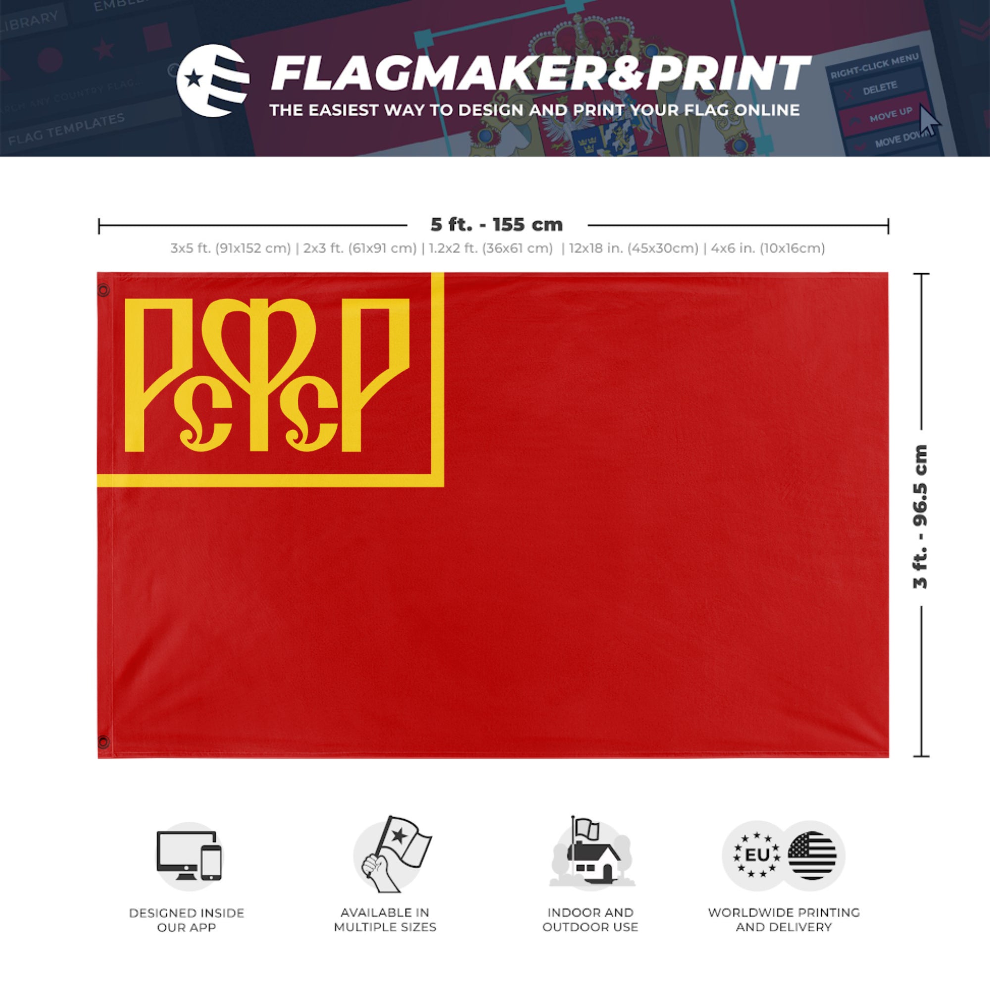 Our integrated flag maker app allows anyone to design and print their own flag. After finishing your design, you can print your flag in three easy steps.
