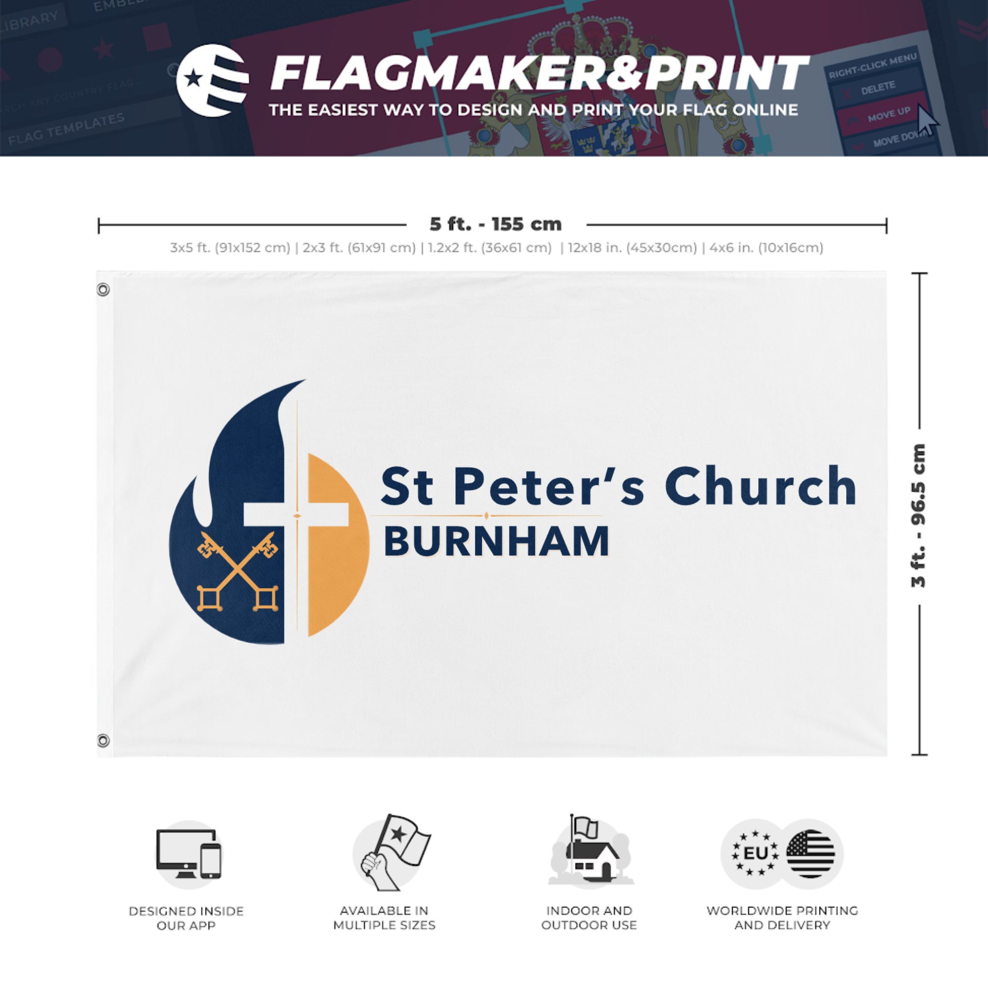 Our integrated flag maker app allows anyone to design and print their own flag. After finishing your design, you can print your flag in three easy steps.