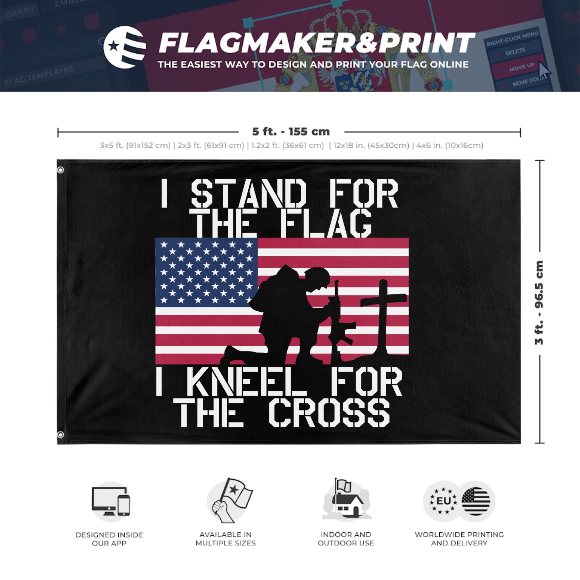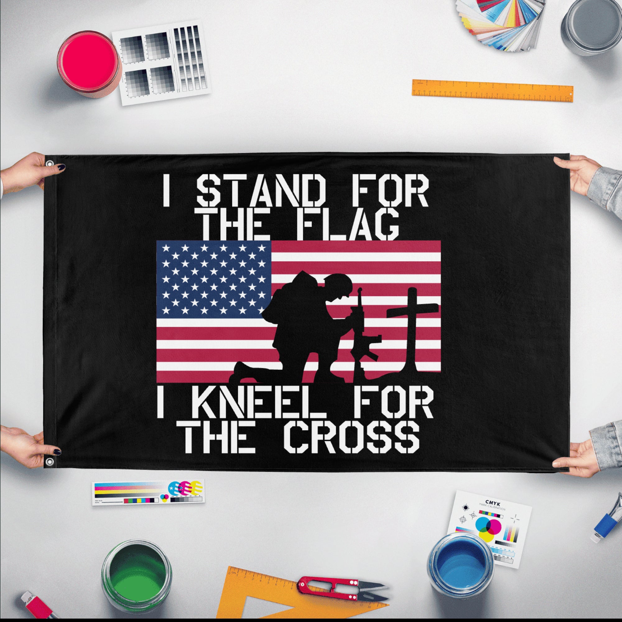 ✒️ The "Stand for the Flag, Kneel for the Cross" flag is a symbolic design commonly seen in the United States that expresses a blend of patriotic and religious sentiment. Featuring imagery such as the American flag alongside a Christian cross, often accompanied by the phrase itself, the flag conveys support for standing during the national anthem as a sign of respect for the country, while also emphasizing kneeling in reverence to Christian faith. It is frequently used to reflect personal beliefs regarding national pride and religious devotion, particularly among individuals who advocate for traditional values in both civic and spiritual contexts.