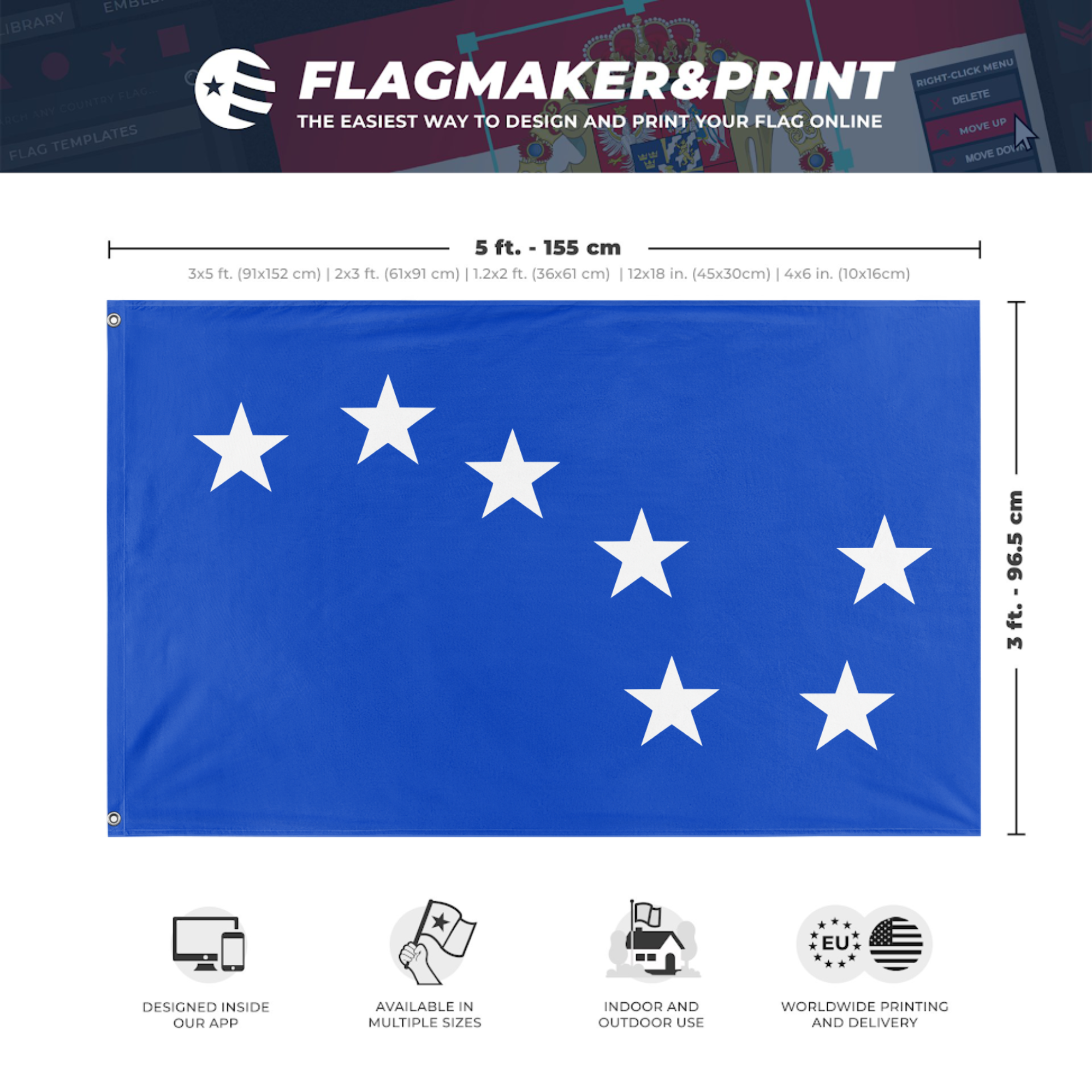 Our integrated flag maker app allows anyone to design and print their own flag. After finishing your design, you can print your flag in three easy steps.