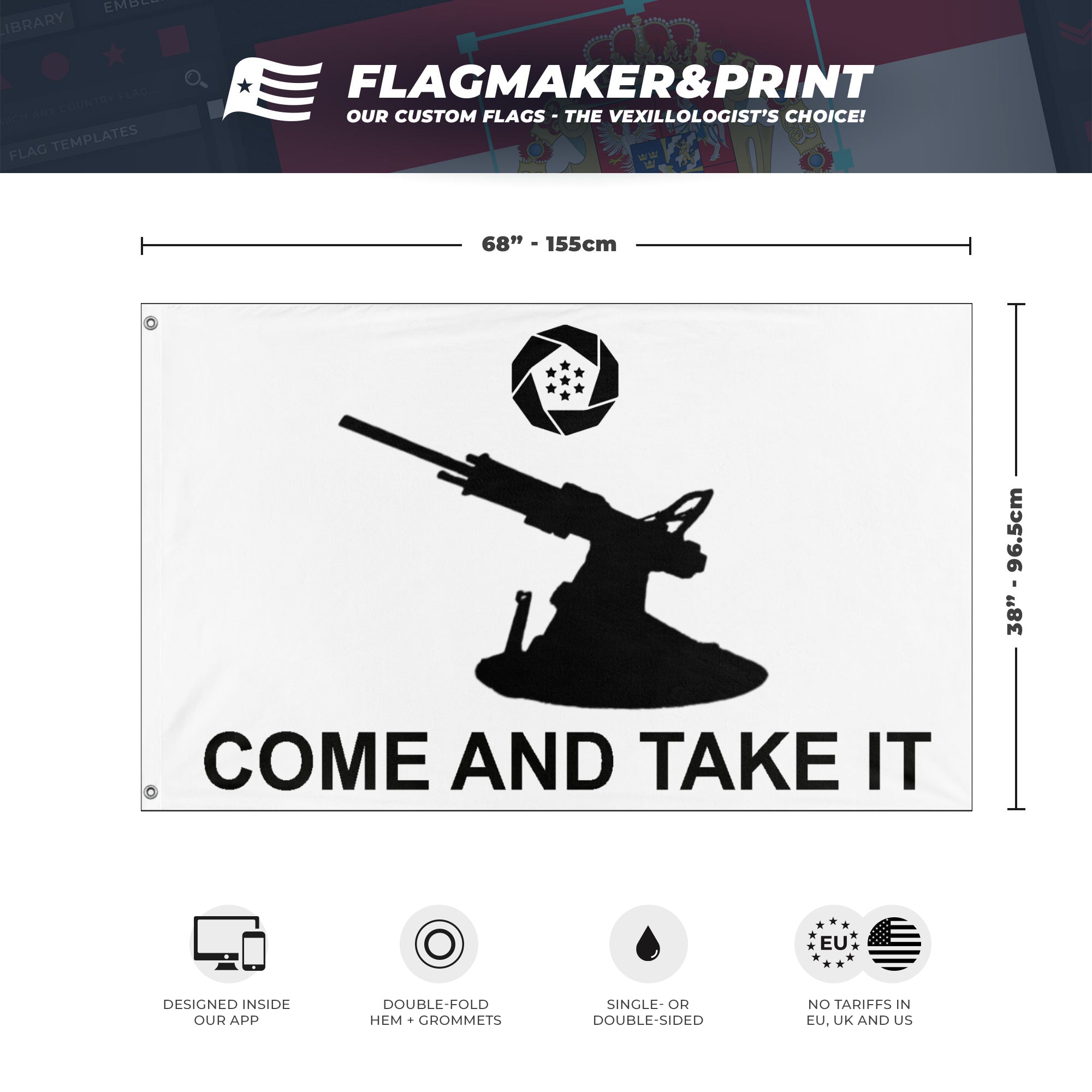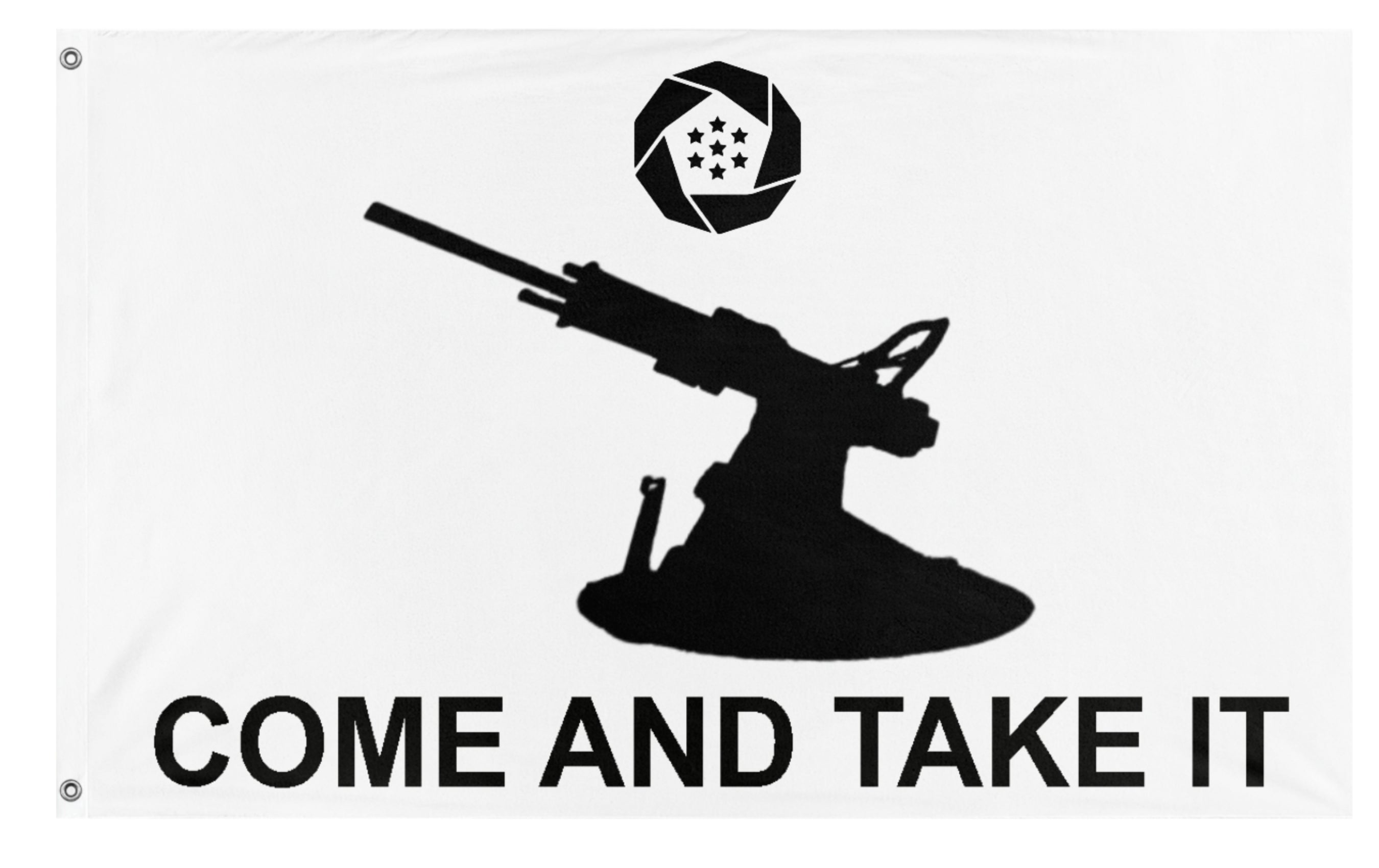 ✒️ Parody of the "Come and Take It" flag from the Battle of Gonzales during the Texas Revolution based on Ace Combat 7. Features anti-asteroid railgun cannon from Stonehenge as well as the symbol of the Kingdom of Erusea. Remade slightly in order to remove the black border around the flag that was not present during the creation and mockup process but was present in the original final product. «That's what V2 is for.»