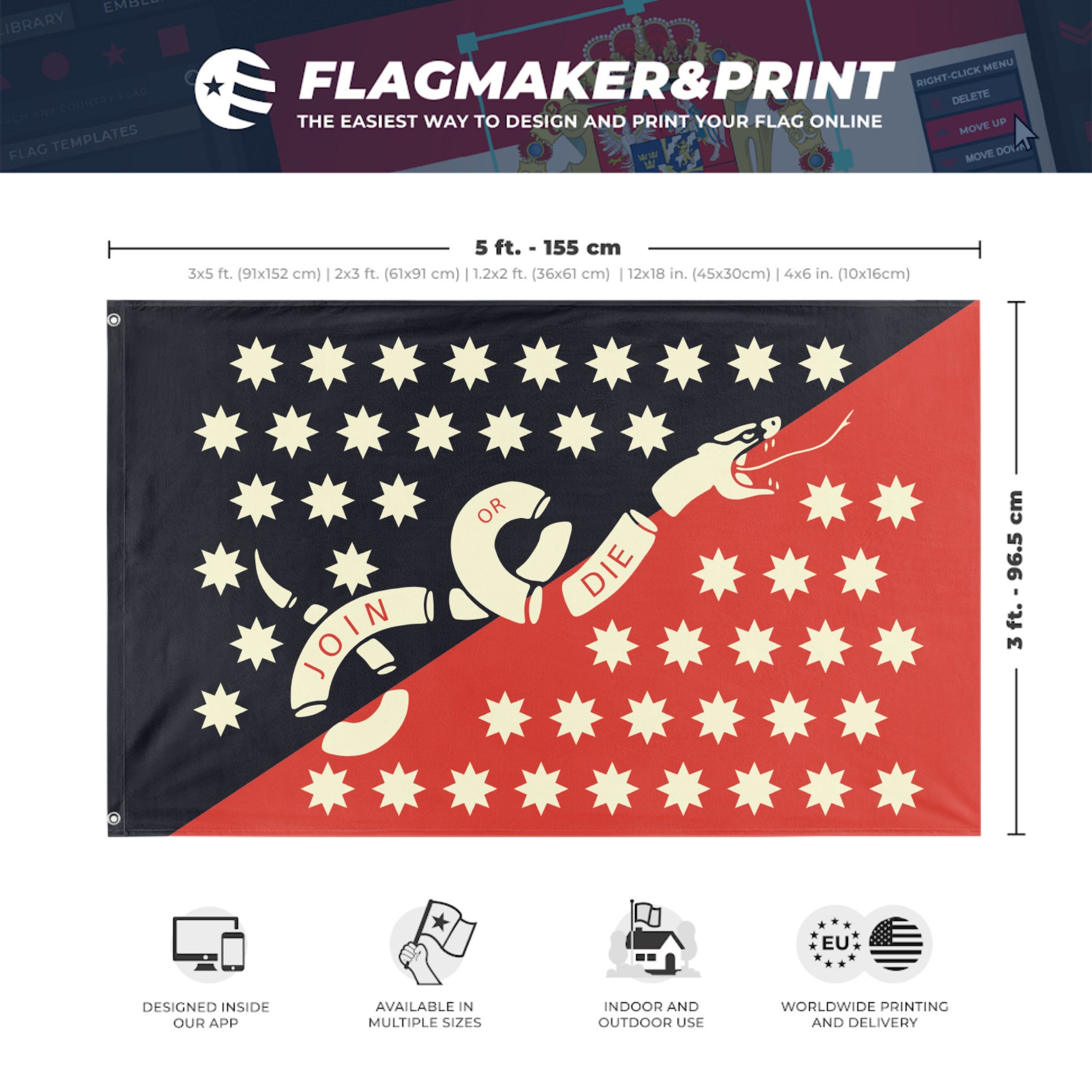 ✒️ The Syndicalist American Flag, also identified as the Syndicalist US Navy Jack, is a fictional flag created by Areoformer of the Kaiser Cat Collective for the alternate-history webseries The Divided States. The design features a field divided diagonally (per bend sinister) into black and red, which are traditional colors associated with anarcho-syndicalism. The flag is charged with 50 white stars, 25 on each field, and a large, central emblem of a segmented rattlesnake coiled with the motto "JOIN OR DIE," a direct reference to the symbol of American colonial unity. According to its creators, the flag's symbolism is an intentional fusion of historical and political iconography. The design "references original Russian Communist naval symbols," which is then "merged with American 'Join or Die' symbology." This combination recontextualizes the American revolutionary symbol within a syndicalist framework, creating a unique naval jack for the fictional American faction in The Divided States universe. (https://dividedstates-project.com/)
