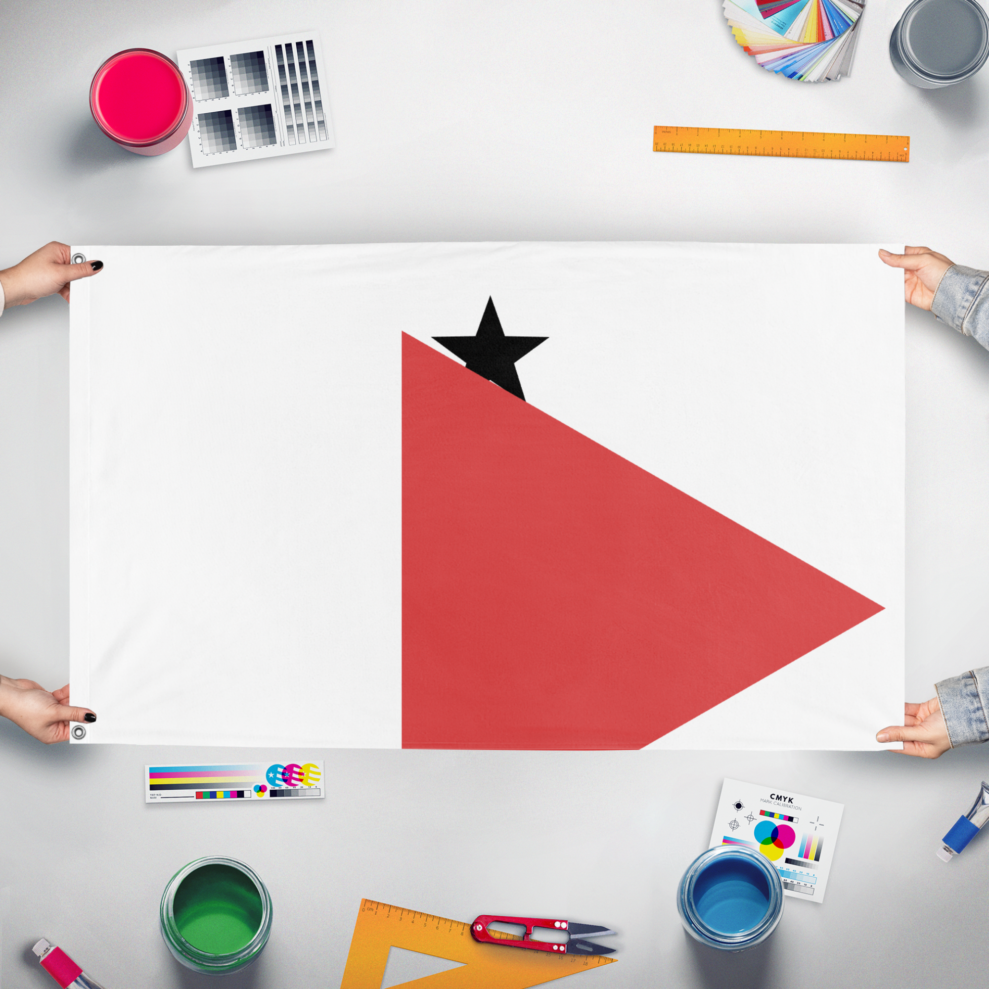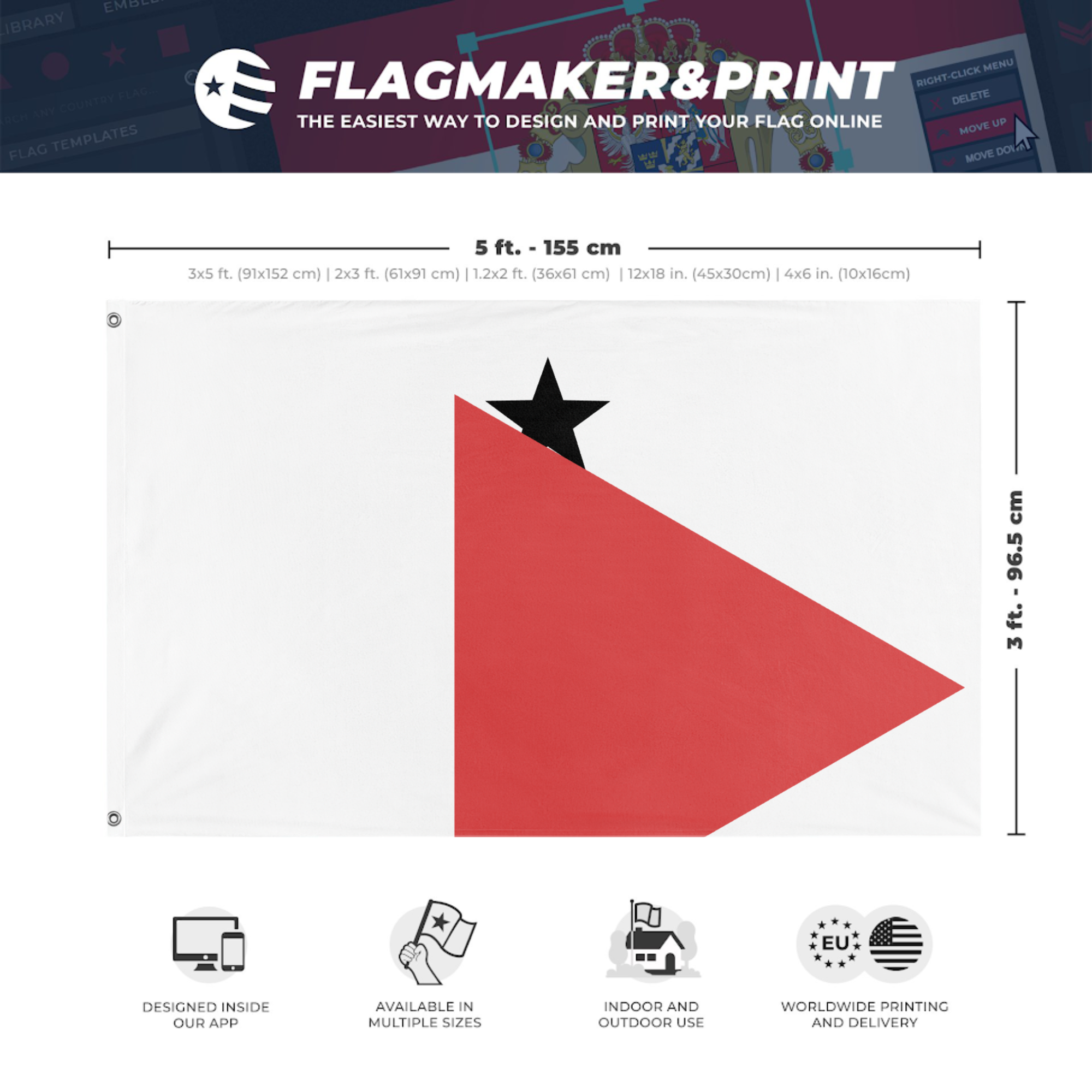 Our integrated flag maker app allows anyone to design and print their own flag. After finishing your design, you can print your flag in three easy steps.