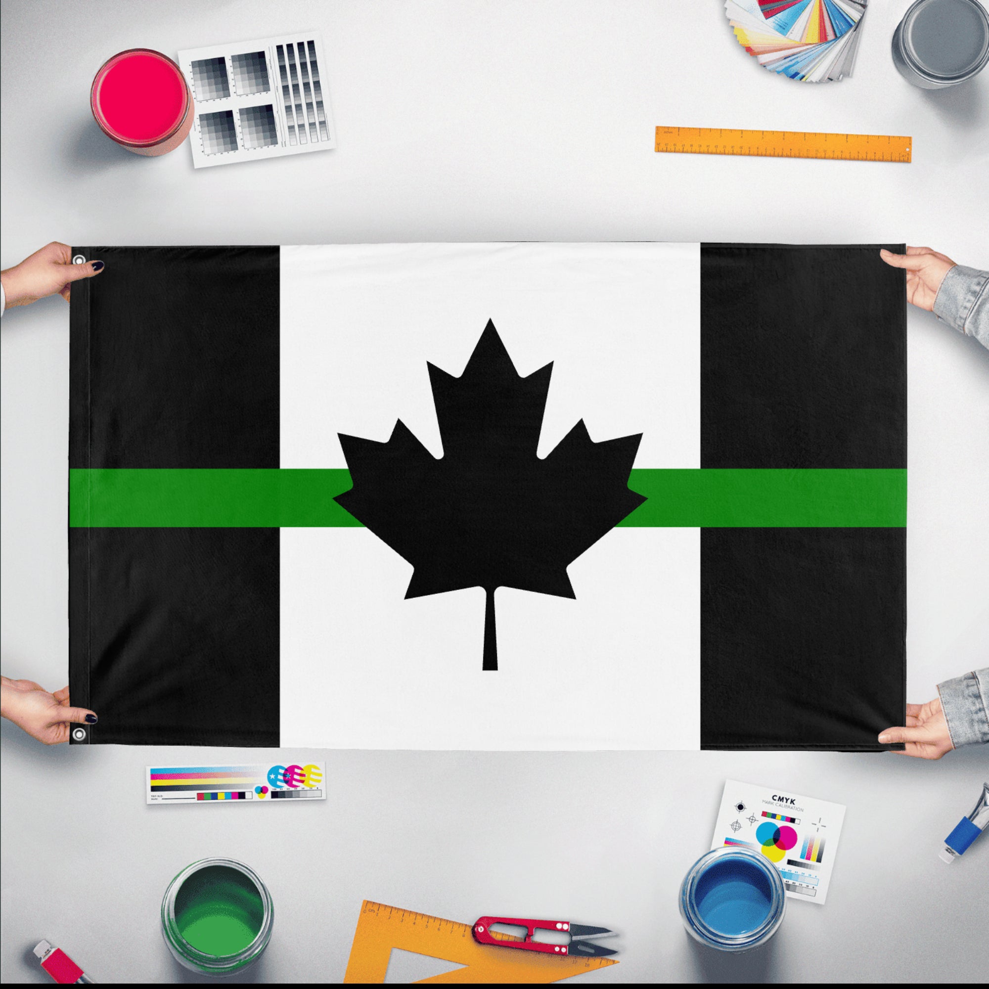 ✒️ The Thin Green Line Canada flag is a variation of the Canadian flag that incorporates a single green stripe, typically displayed across a monochromatic or subdued version of the national flag. It is used to represent and honor members of the Canadian Armed Forces, as well as conservation officers and other personnel involved in environmental protection and national defense. The green line symbolizes service, vigilance, and the commitment of these individuals to the safety, sovereignty, and natural heritage of Canada. The flag serves as a visual expression of support and recognition for their contributions to the country.