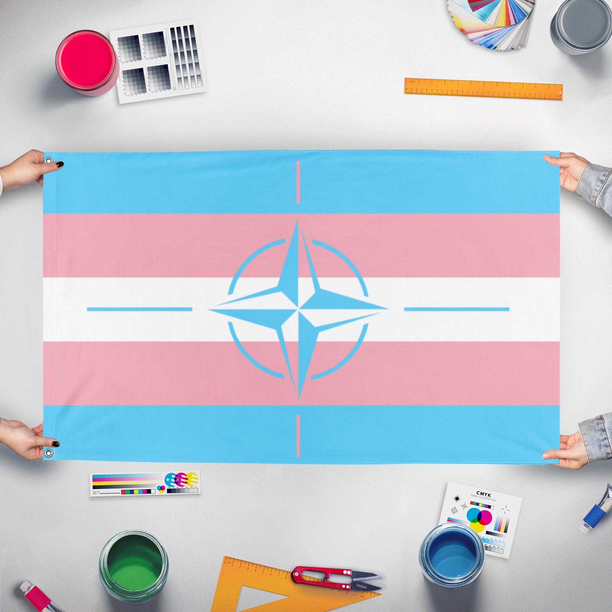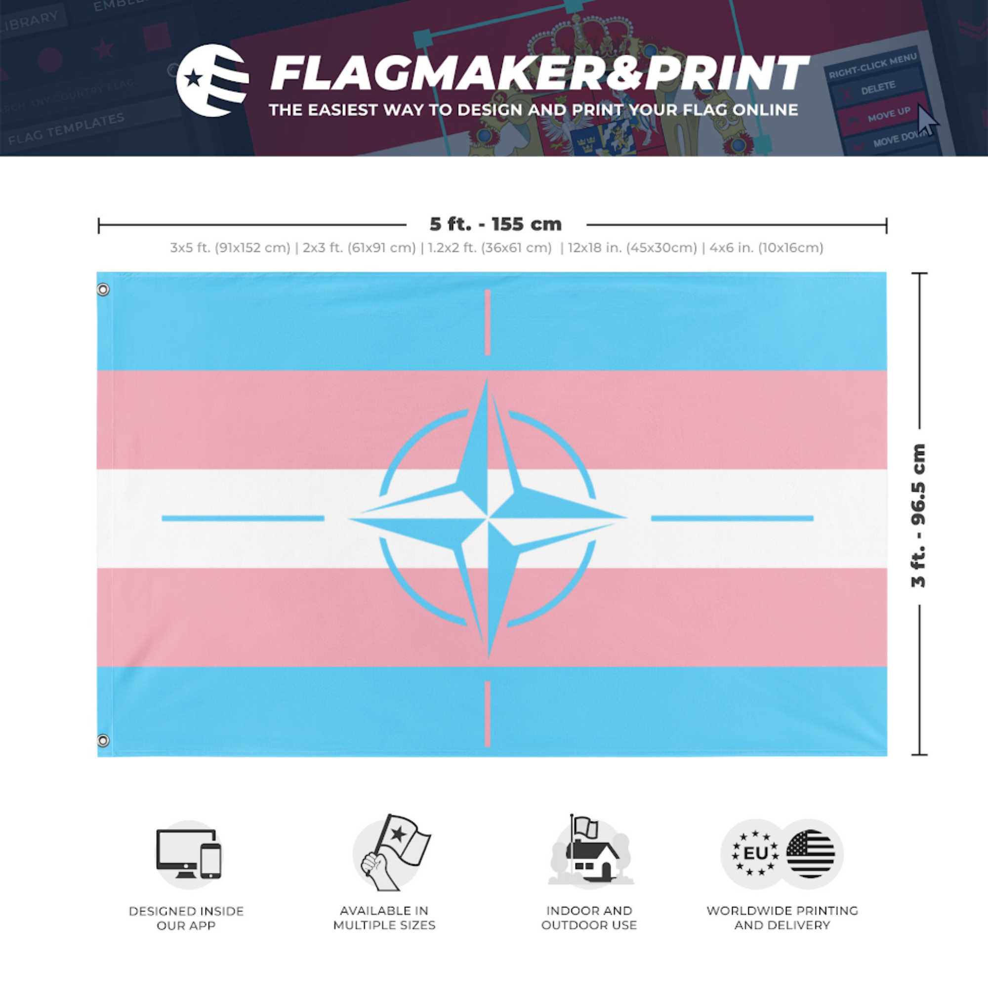 Our integrated flag maker app allows anyone to design and print their own flag. After finishing your design, you can print your flag in three easy steps.