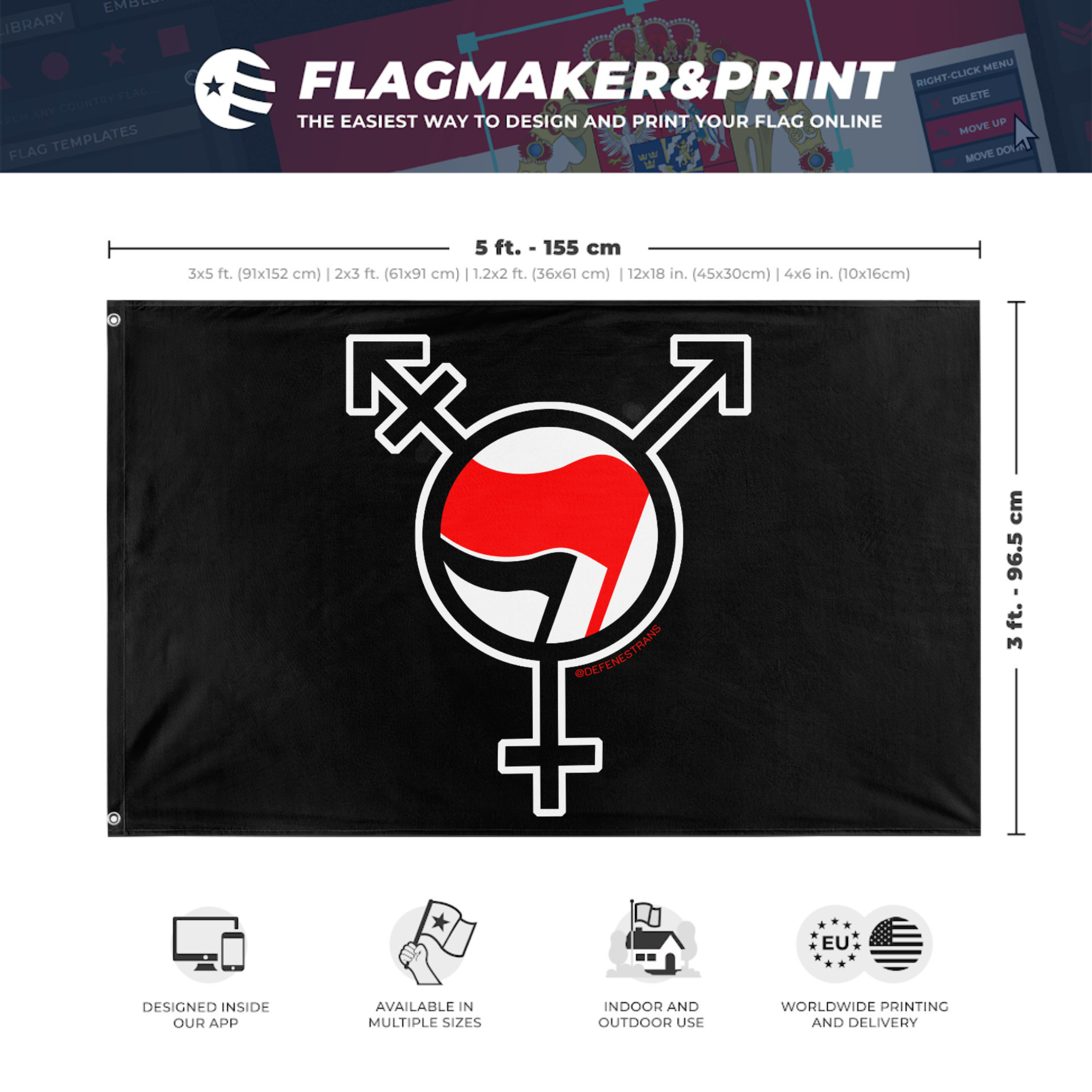 Our integrated flag maker app allows anyone to design and print their own flag. After finishing your design, you can print your flag in three easy steps.