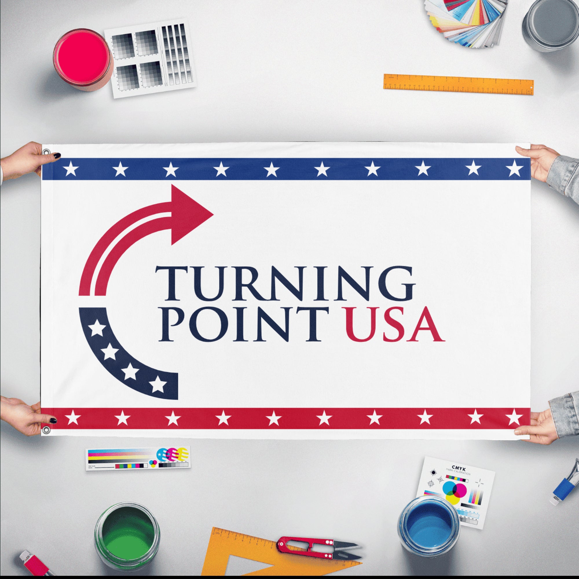 ✒️ a flag design for Turning Point USA. Their symbol bold in the center on a white background, flanked by a red and blue banner with stars.