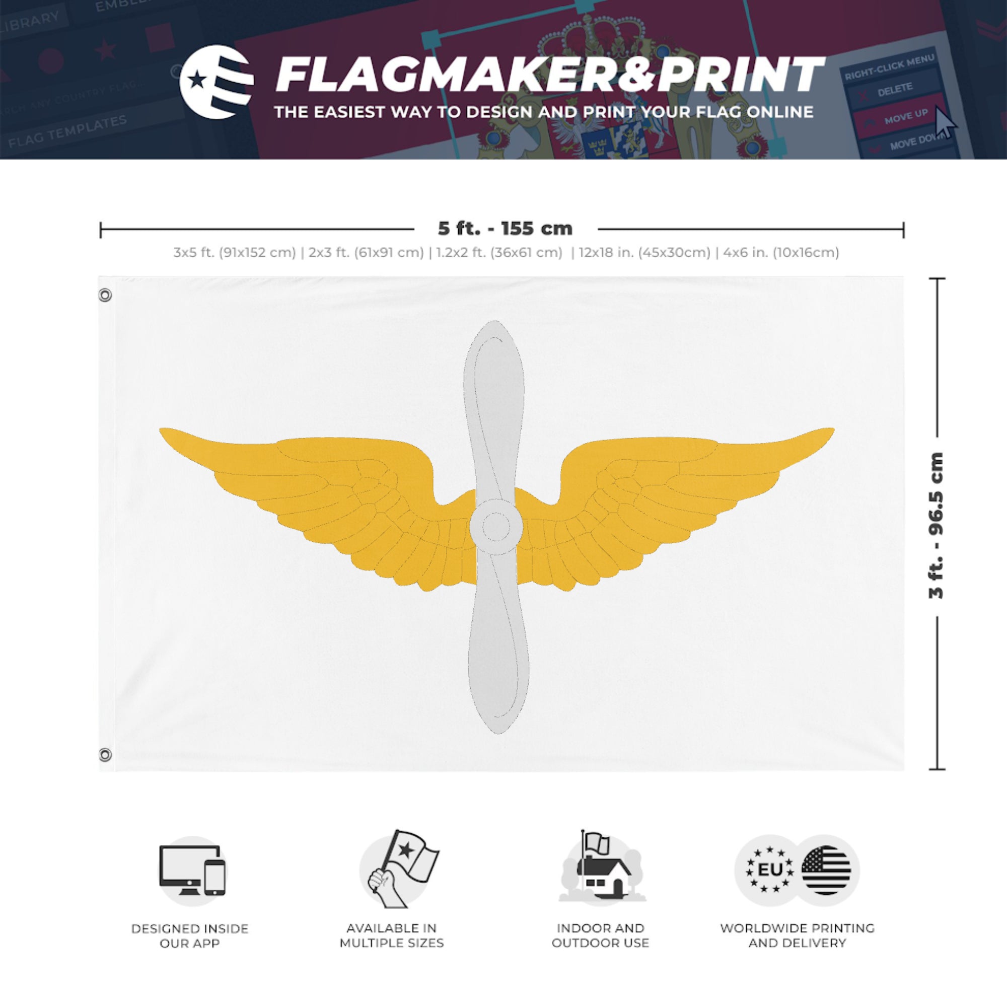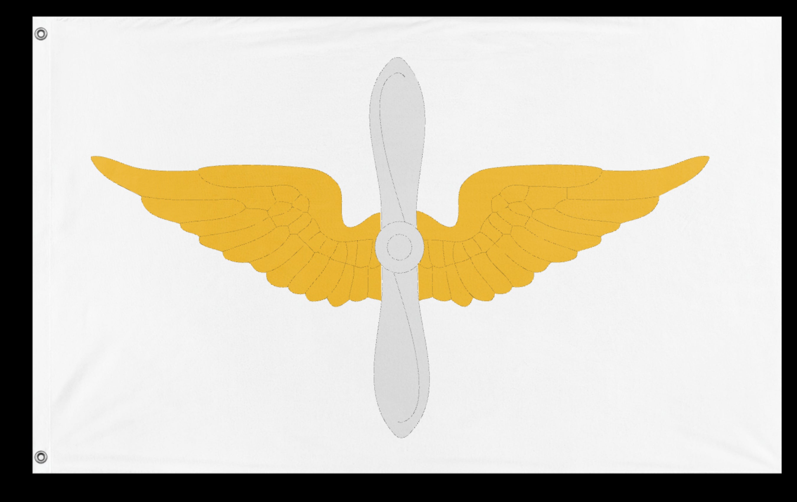 ✒️ The U.S. Army Aviation Branch Flag symbolizes the Army Aviation Branch, which provides aerial support, reconnaissance, transport, and combat capabilities to ground forces. The flag features a golden orange field—the official branch color representing the dawn sky and flight—bordered and accented by ultramarine blue, which reflects the traditional color of the Army and the connection to the broader military force. At the center is the Army Aviation branch insignia: a pair of outstretched wings flanking a vertical sword, symbolizing both flight and combat readiness. The combination underscores the branch’s mission to support Army operations from the air. The flag is used in official and ceremonial contexts, representing the speed, versatility, and precision of Army Aviation forces.