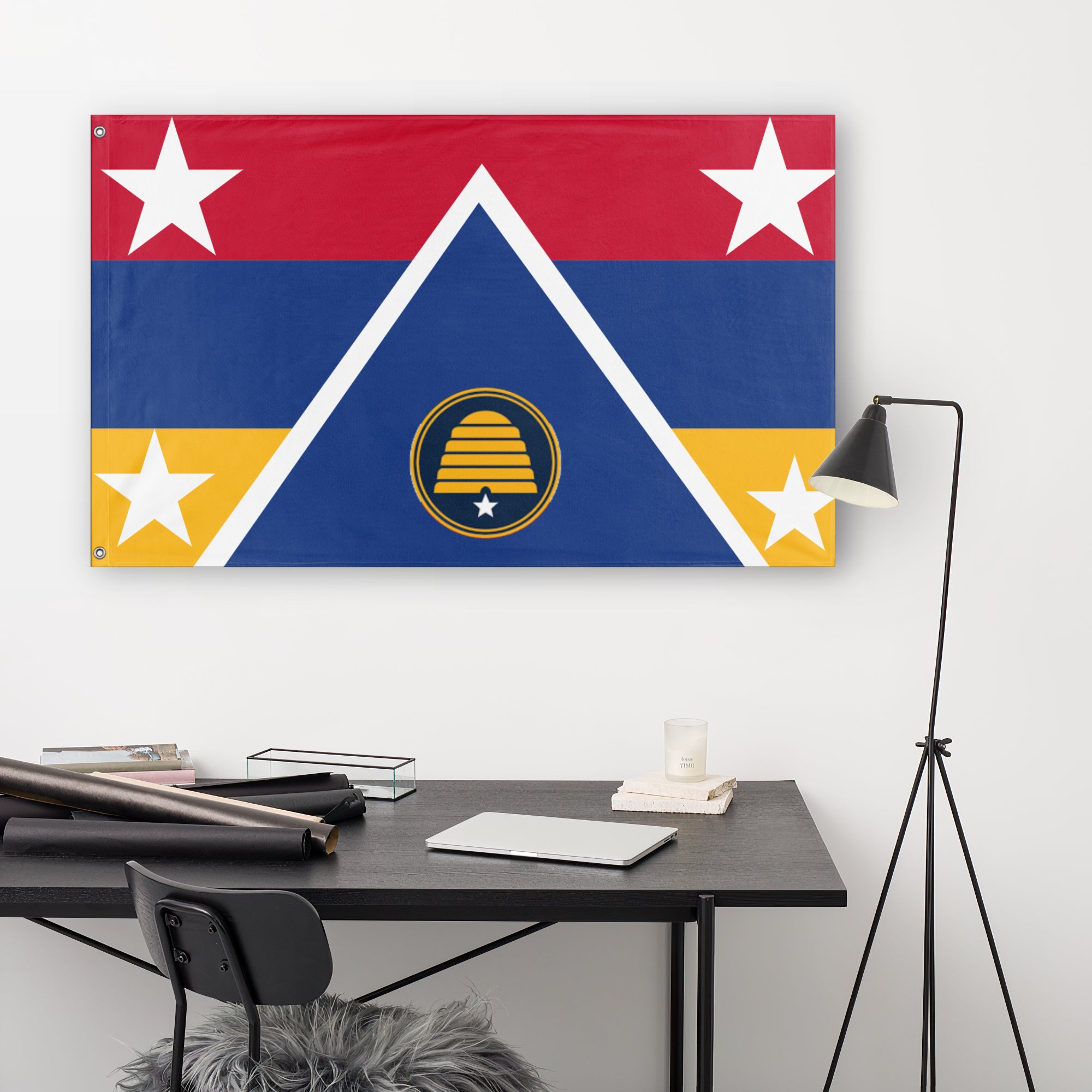 ✒️ The yellow represents the gold rush that leads to railroads built in the state.The blue represents the lakes of the state.The red represents the blood spilled in the Civil War. The 4 stars represent the 4 corner states Colorado,Utah,New Mexico, Arizona. The beehive represents industry.