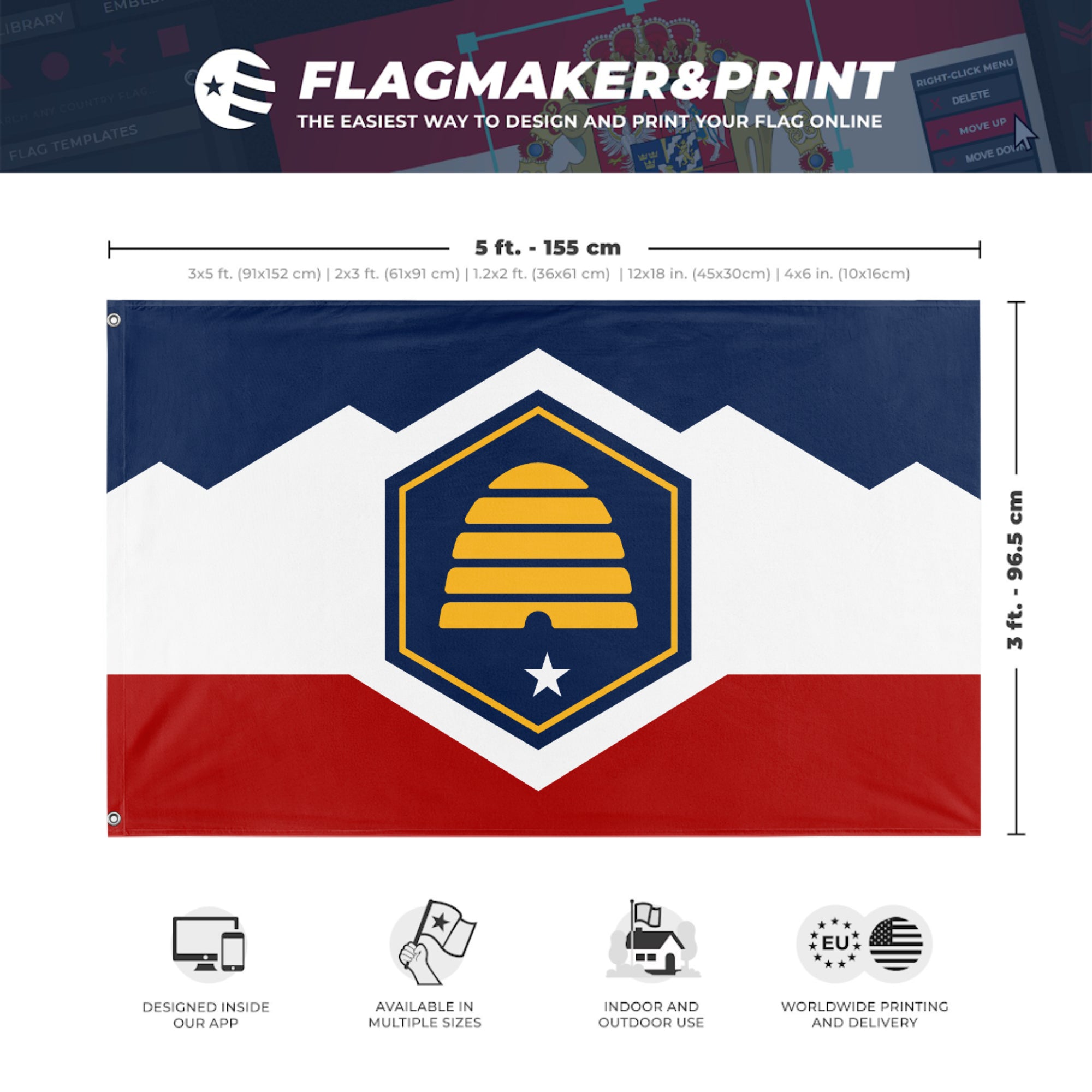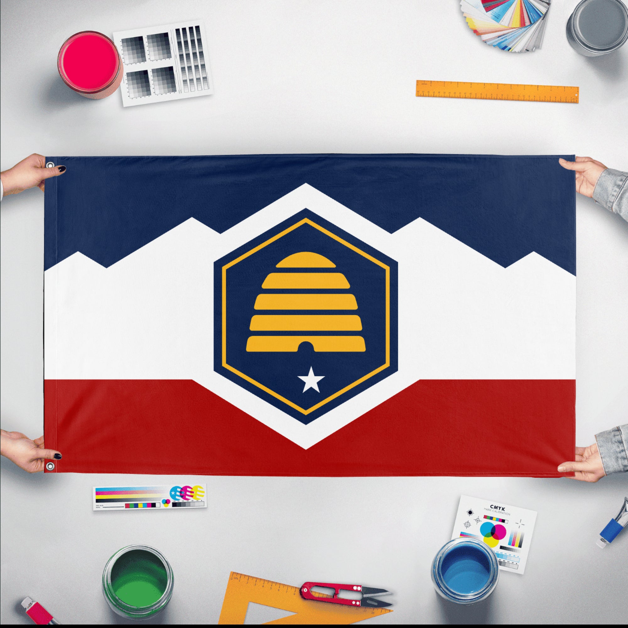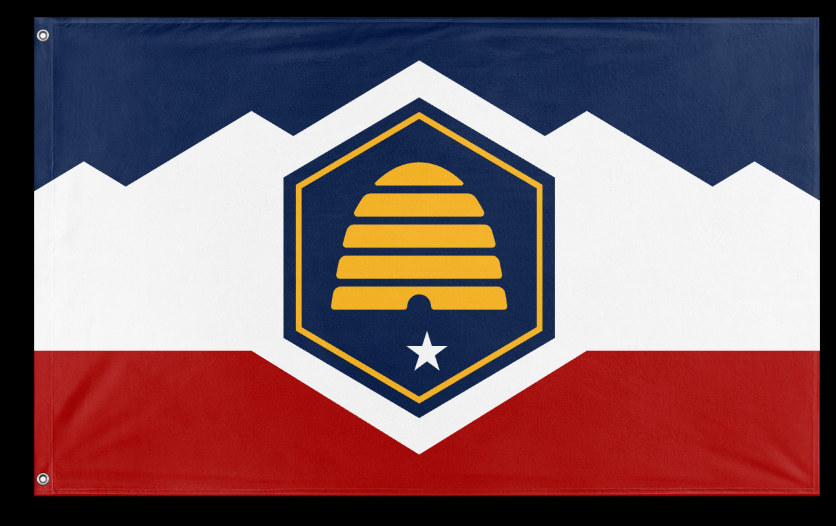 ✒️ The flag of Utah features a dark blue field with the state seal at its center, which includes a bald eagle perched above a beehive—a symbol of industry and the pioneer spirit. Surrounding the beehive are sego lilies, the state flower, representing peace. The seal also displays two American flags and the date 1847, marking the arrival of Mormon pioneers. Below the seal is a banner with the word “Utah” and the year 1896, when Utah was admitted to the Union. Adopted in its current form in 1913, the flag embodies Utah’s heritage, values, and history.