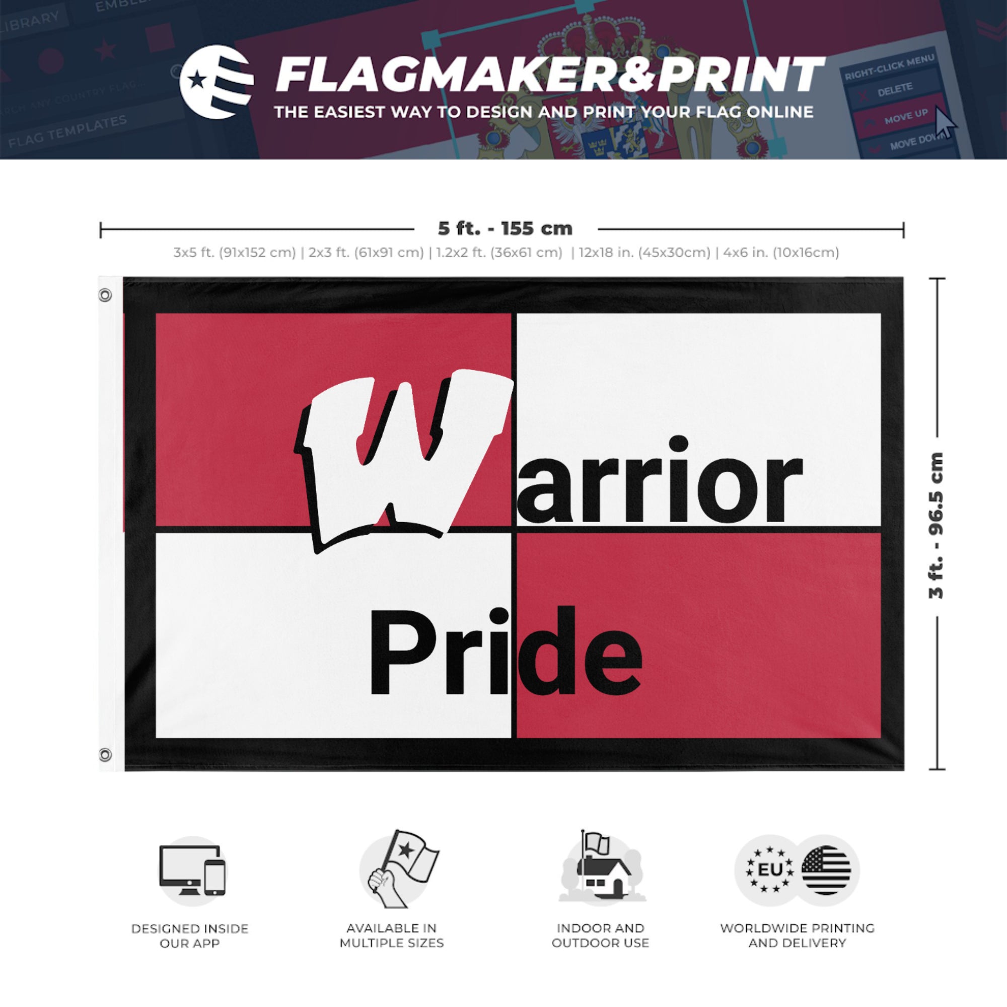 Our integrated flag maker app allows anyone to design and print their own flag. After finishing your design, you can print your flag in three easy steps.