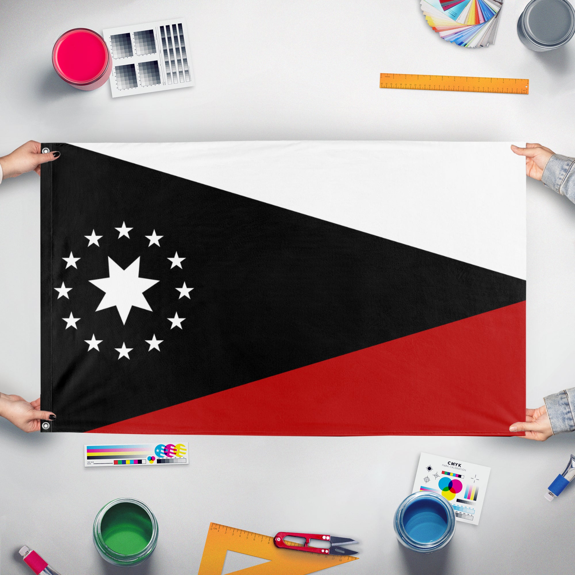 Our integrated flag maker app allows anyone to design and print their own flag. After finishing your design, you can print your flag in three easy steps.
